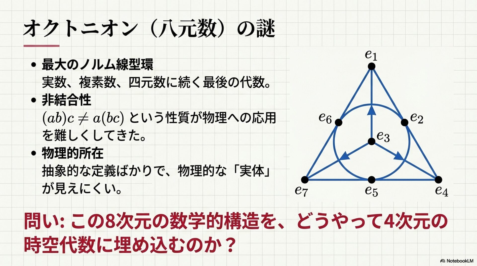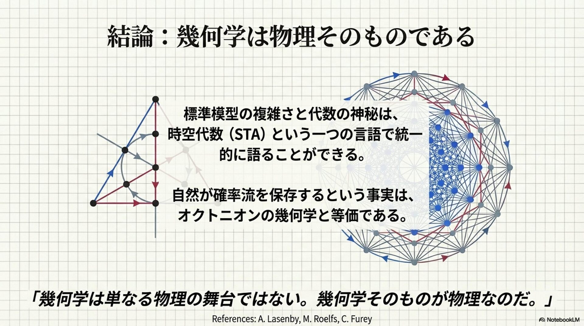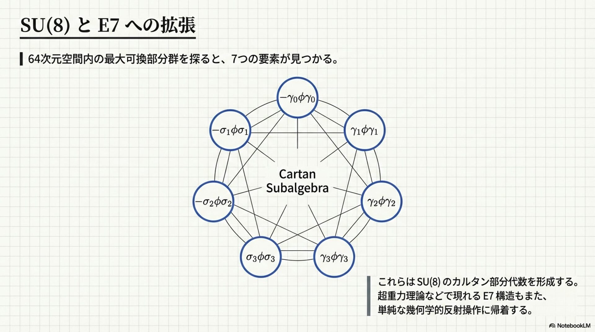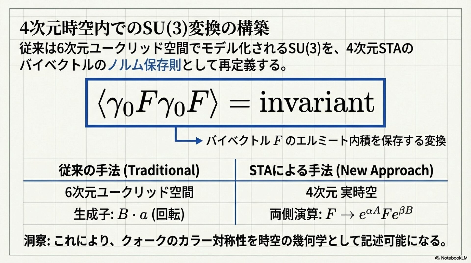 幾何代数(Geometric Algebra)の枠組みを用いて、素粒子物理学における標準模型の対称性を4次元の時空構造のみから導き出す可能性を追求したものです。著者のアンソニー・ラセンビーは、複素数や高次元空間に頼ることなく、時空代数(STA)内部で強い相互作用のSU(3)対称性や八元数(Octonions)を完全に表現できることを数学的に証明しました。特に、八元数のノルム保存がディラック流の保存と一致するという発見は、物理的対称性が時空そのものの幾何学的性質に根ざしていることを示唆しています。最終的に、これらの手法を例外型リー群であるG2やE7の解析へと拡張することで、重力を含む全相互作用を単一の幾何学的言語で統合することを目指しています。