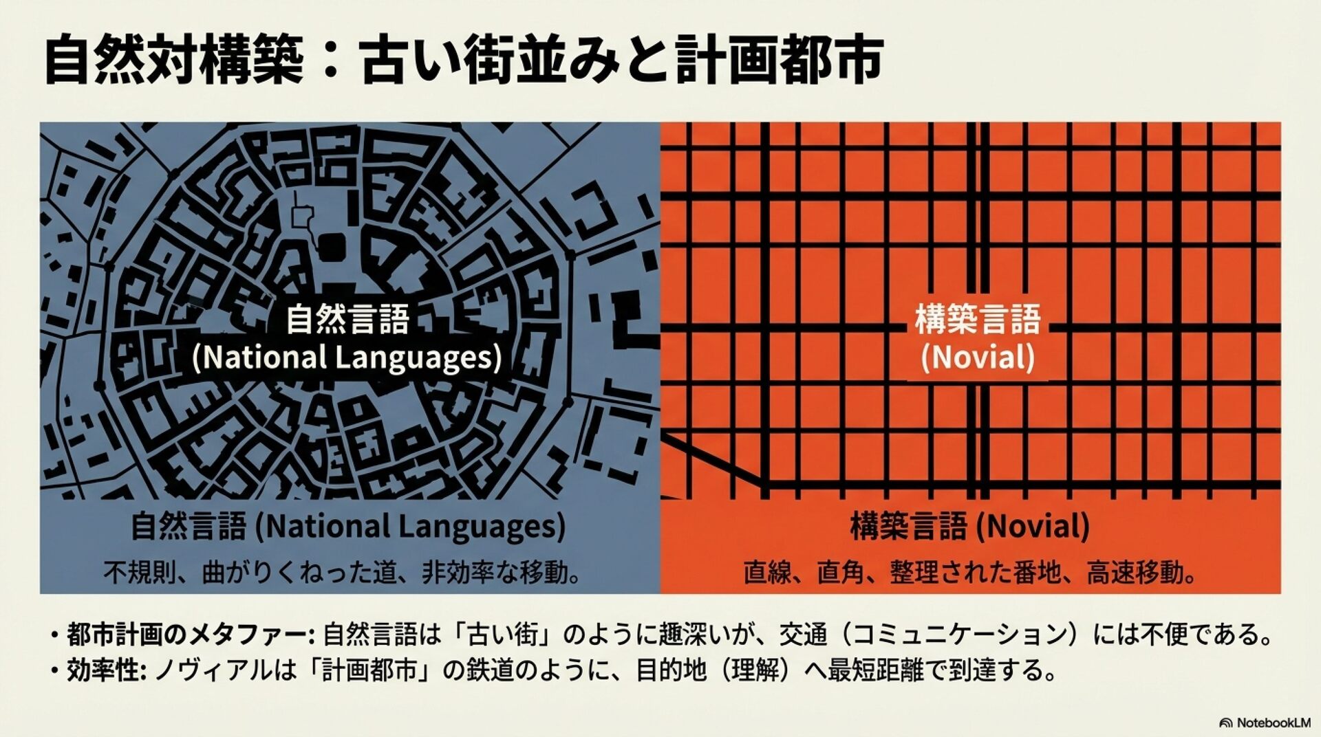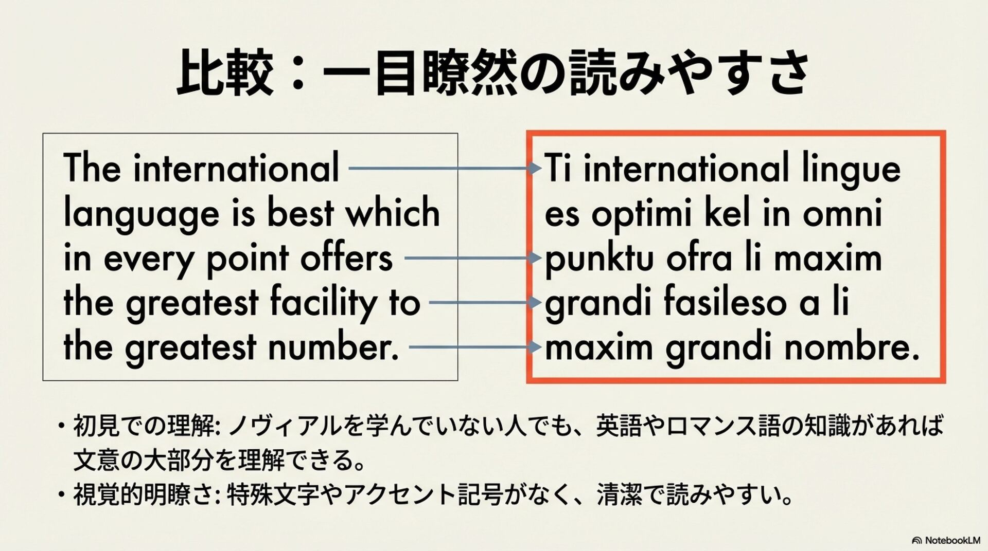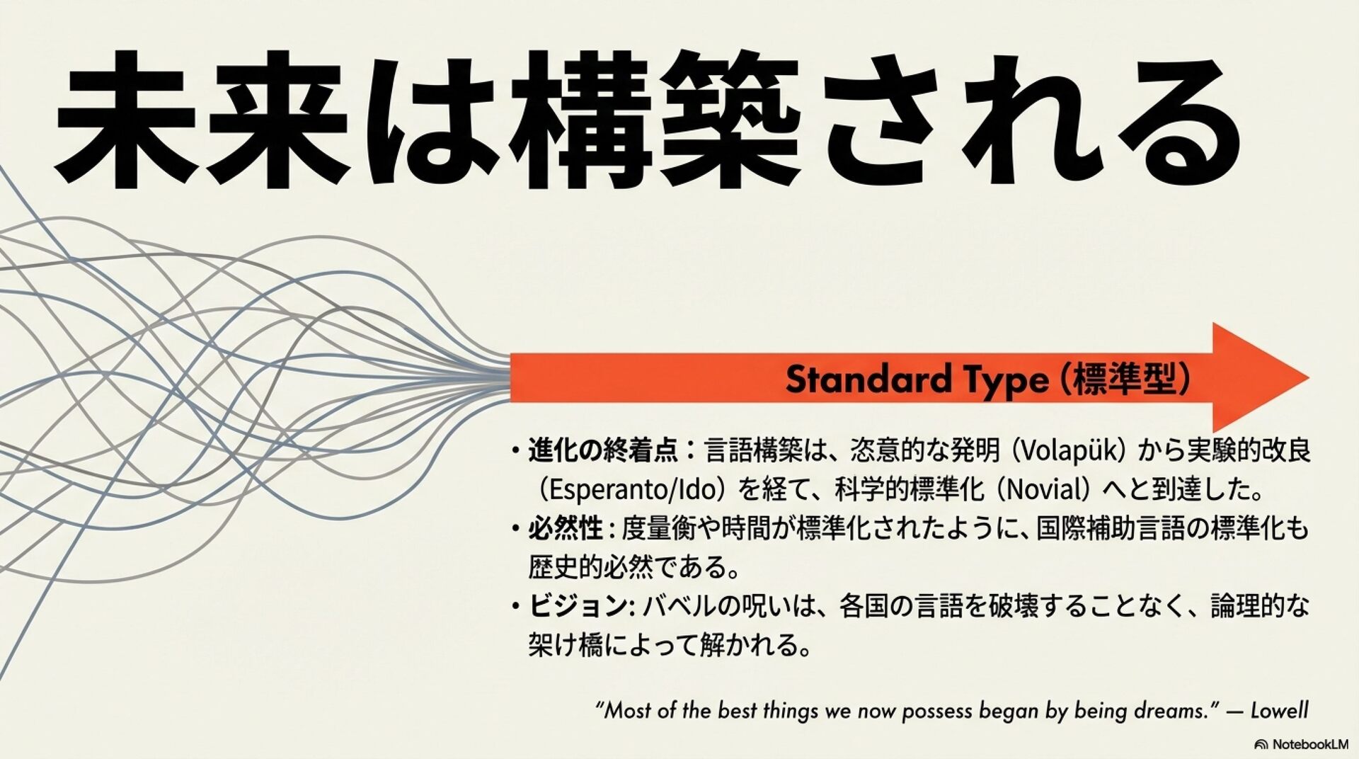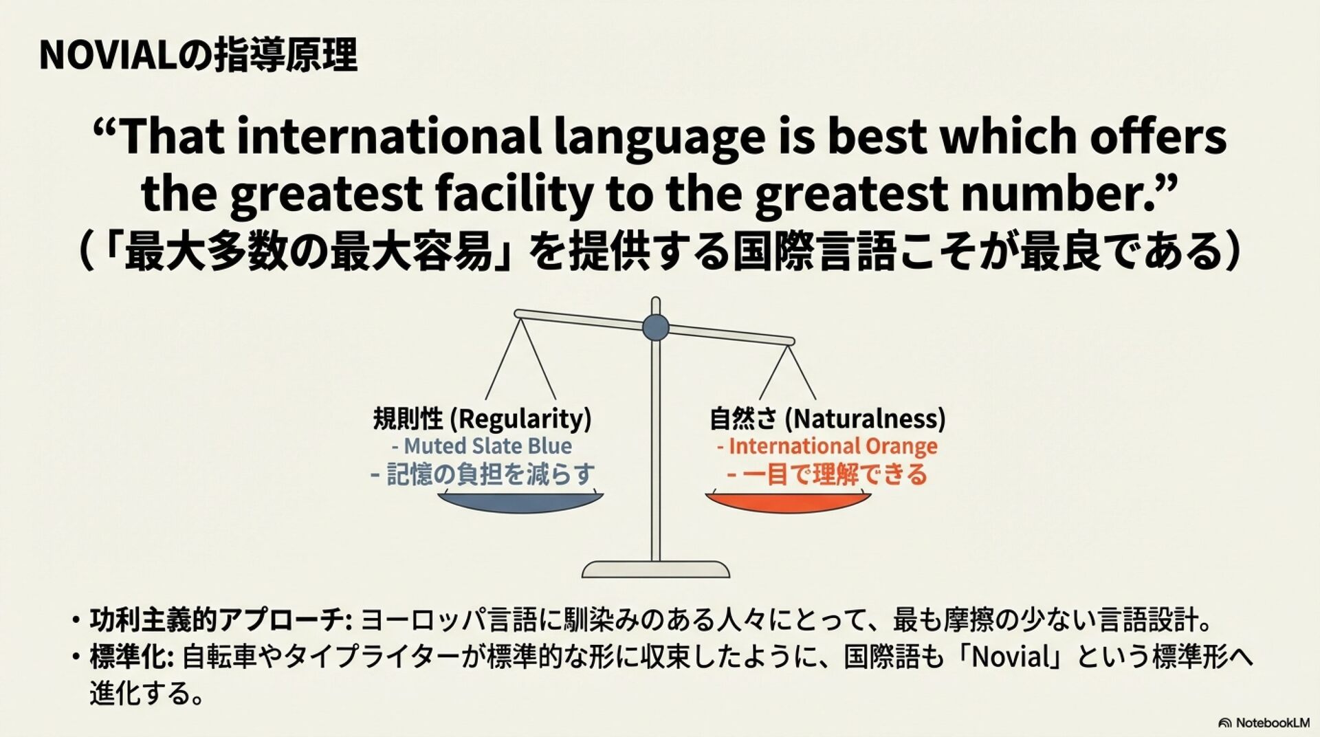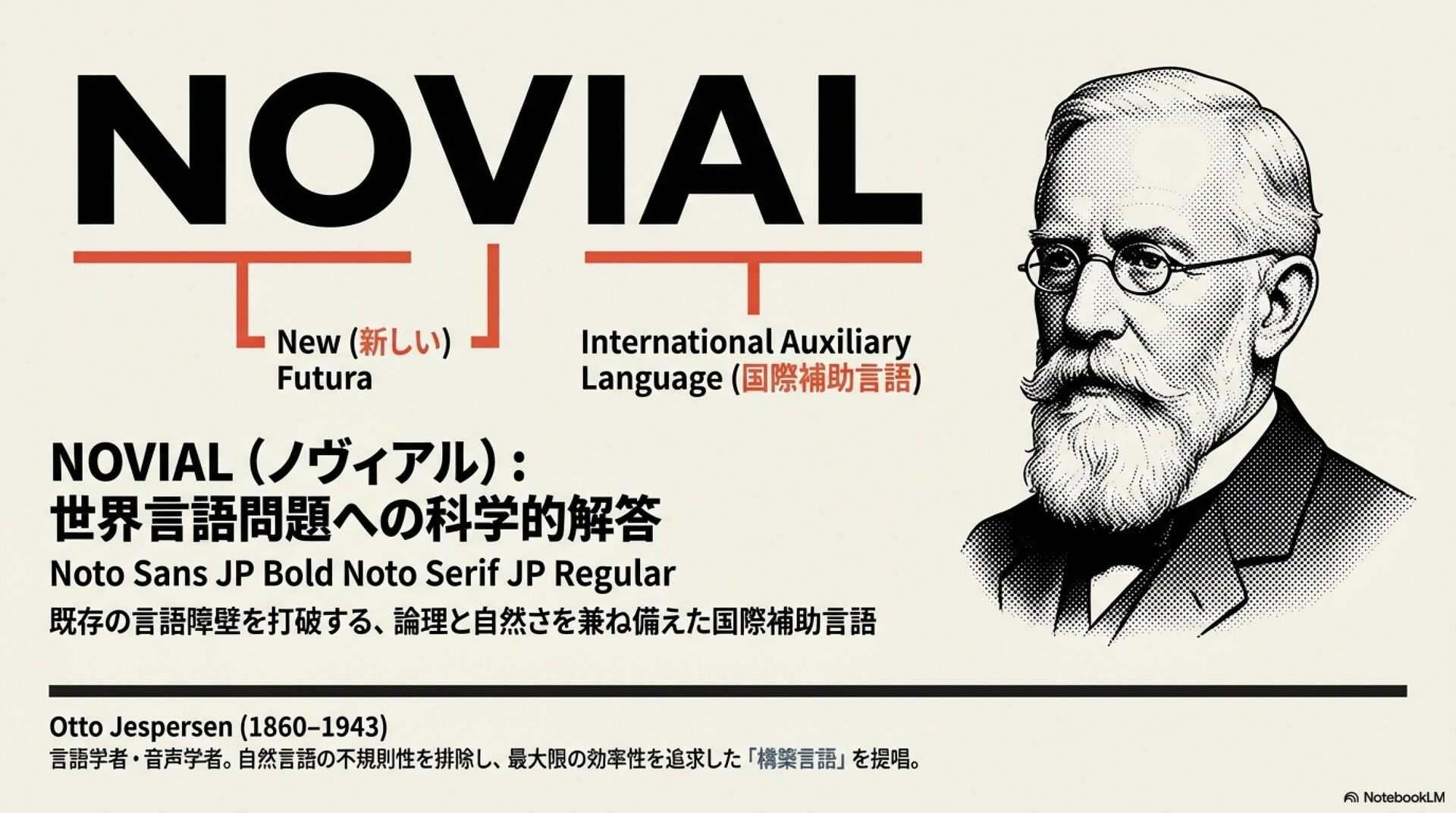 オットー・イェスペルセンが考案した国際補助語ノヴィアル(Novial)の提案を目的としています。筆者はまず、「人工言語」が抱える先入観を払拭し、「構築された言語」という用語を提唱します。そして、ヨーロッパを旅する際の言語の障壁や、国際会議における通訳の必要性といった国際補助語の必要性を強調しています。また、既存のどの「国語」も国際語として選ばれることの難しさや、ラテン語がすでにその役割を失っていることを指摘し、人工言語の優位性を主張します。イェスペルセンは、過去の人工言語であるエスペラントやイドの欠点を分析し、自身のノヴィアルがいかに簡潔で規則的、かつ国際的に理解しやすいように設計されているかを具体例を挙げて説明しています。最終的に、国際補助語の普及が人類の知的交流を劇的に発展させると結論付けています。