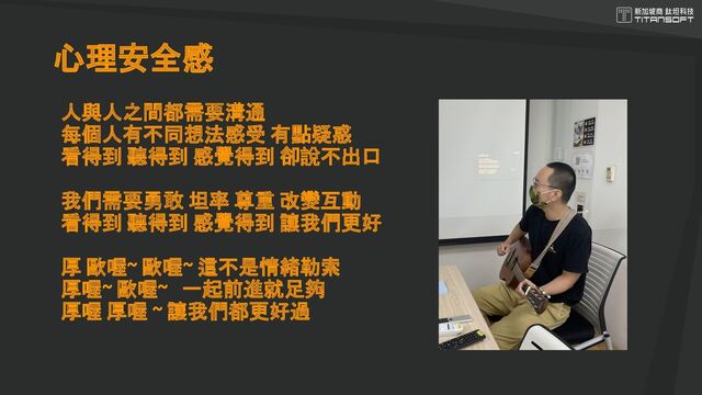 促進心理安全感可以怎麼做? 1. 適合開放討論的題目,每個人都先把想法寫在便利貼上,再輪流 發言,資深或職級較高的人最後發言 2. 回應想法的時候先帶著好奇瞭解對方、肯定、延遲評論。 企業導入心理安全感- 新加坡商鈦坦科技實作步驟與心得