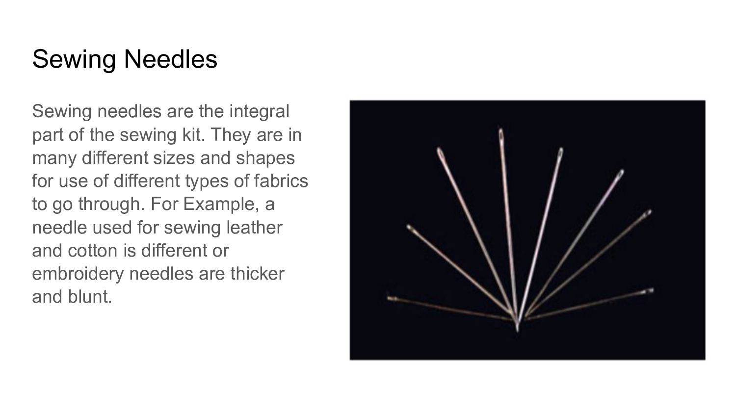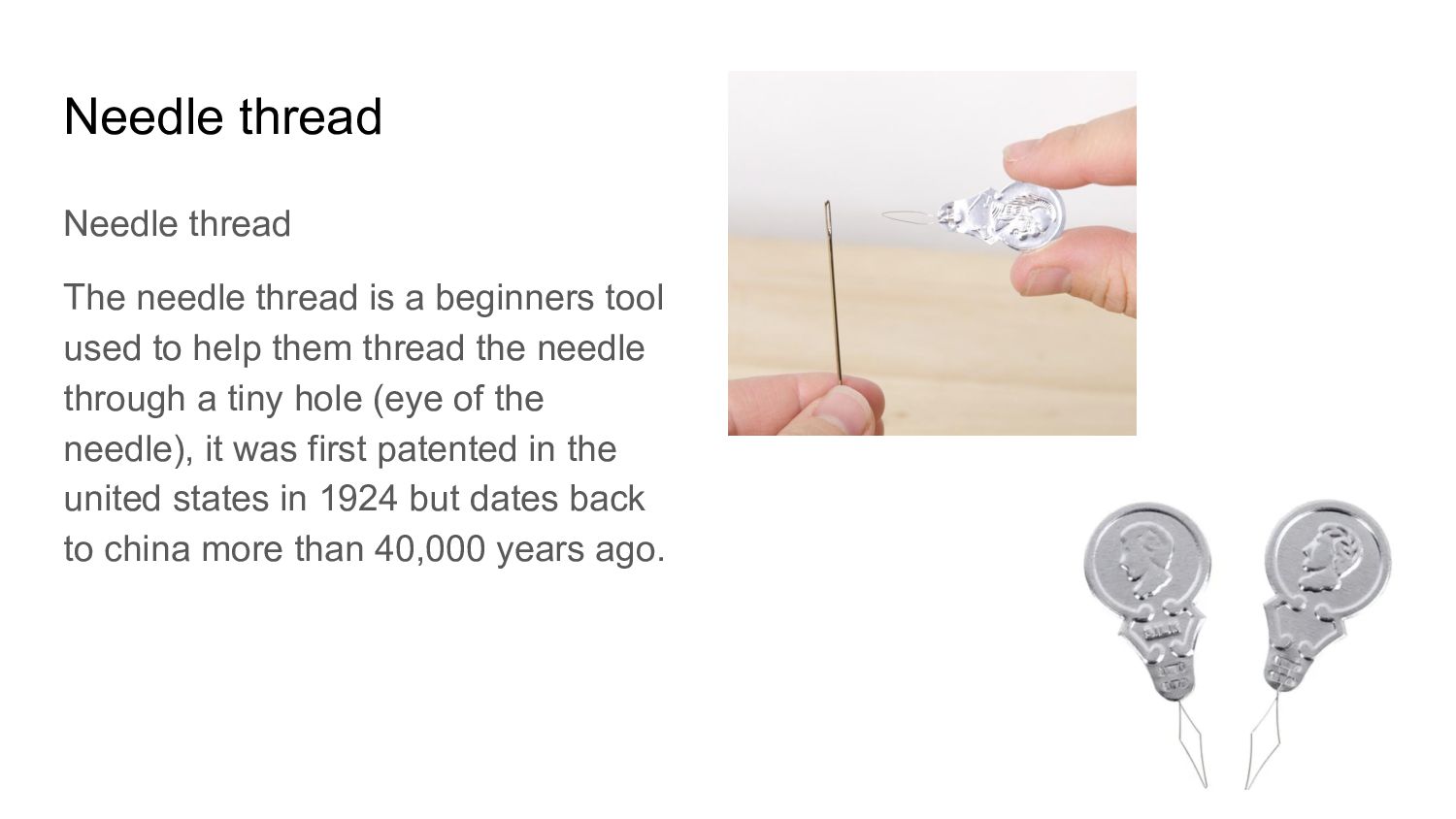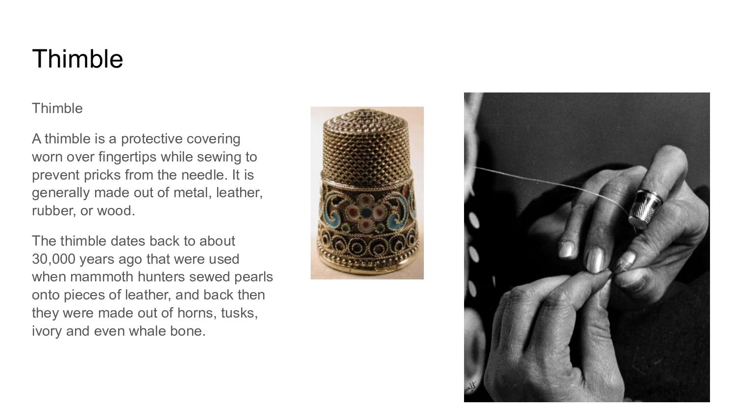 fingertips while sewing to prevent pricks from the needle. It is generally made out of metal, leather, rubber, or wood. The thimble dates back to about 30,000 years ago that were used when mammoth hunters sewed pearls onto pieces of leather, and back then they were made out of horns, tusks, ivory and even whale bone.