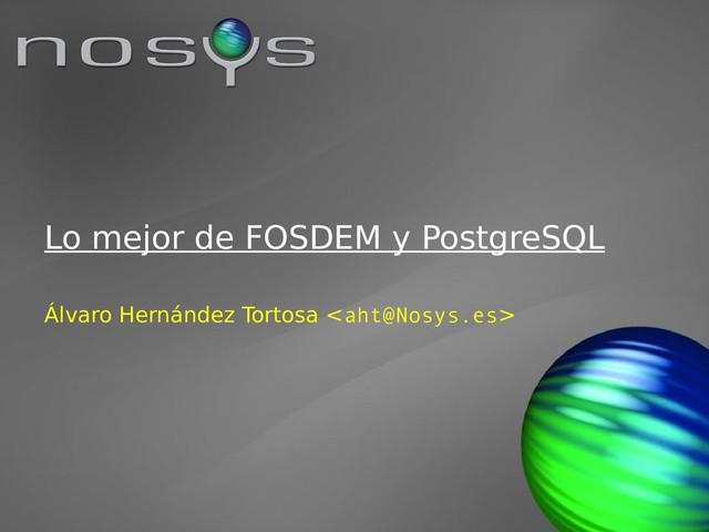 y Director Técnico en NOSYS • ¿Qué hacemos en NOSYS? ✔ Formación, consultoría y desarrollo de software con PostgreSQL (y Java) ✔ Partners de EnterpriseDB ✔ Formación avanzada en Java con Javaspecialists.eu: Java Master Course y Java Concurrency Course ✔ Partners de Amazon AWS. Formación y consultoría en AWS • Twitter: @ahachete • LinkedIn: http://es.linkedin.com/in/alvarohernandeztortosa/