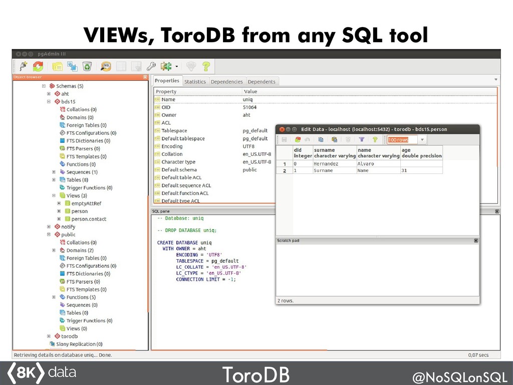 Enter ToroDB. ToroDB is an open source project that behaves as a NoSQL database but runs on top of PostgreSQL, one of the most respected and reliable relational databases. ToroDB offers a document (JSON-like) interface, and implements the MongoDB wire protocol, hence being compatible with existing MongoDB drivers and applications. Rather than using PostgreSQL's jsonb data type, ToroDB explored an innovative approach by transforming JSON documents to a fully relational representation, in an automated way. This brings to the table many advantages like lower disk footprint and automatic data-partitioning, leading to significantly faster queries.
