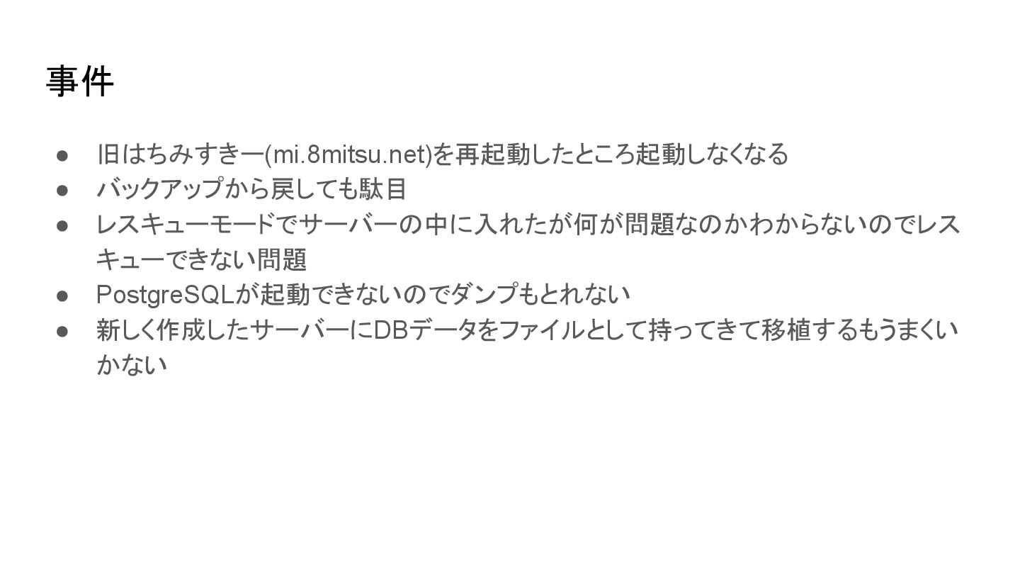 事件 • 旧はちみすきー(mi.8mitsu.net)を再起動したところ起動しなくなる • バックアップから戻しても駄目 • レスキューモードでサーバーの中に入れたが何が問題なのかわからないのでレス キューできない問題 • PostgreSQLが起動できないのでダンプもとれない