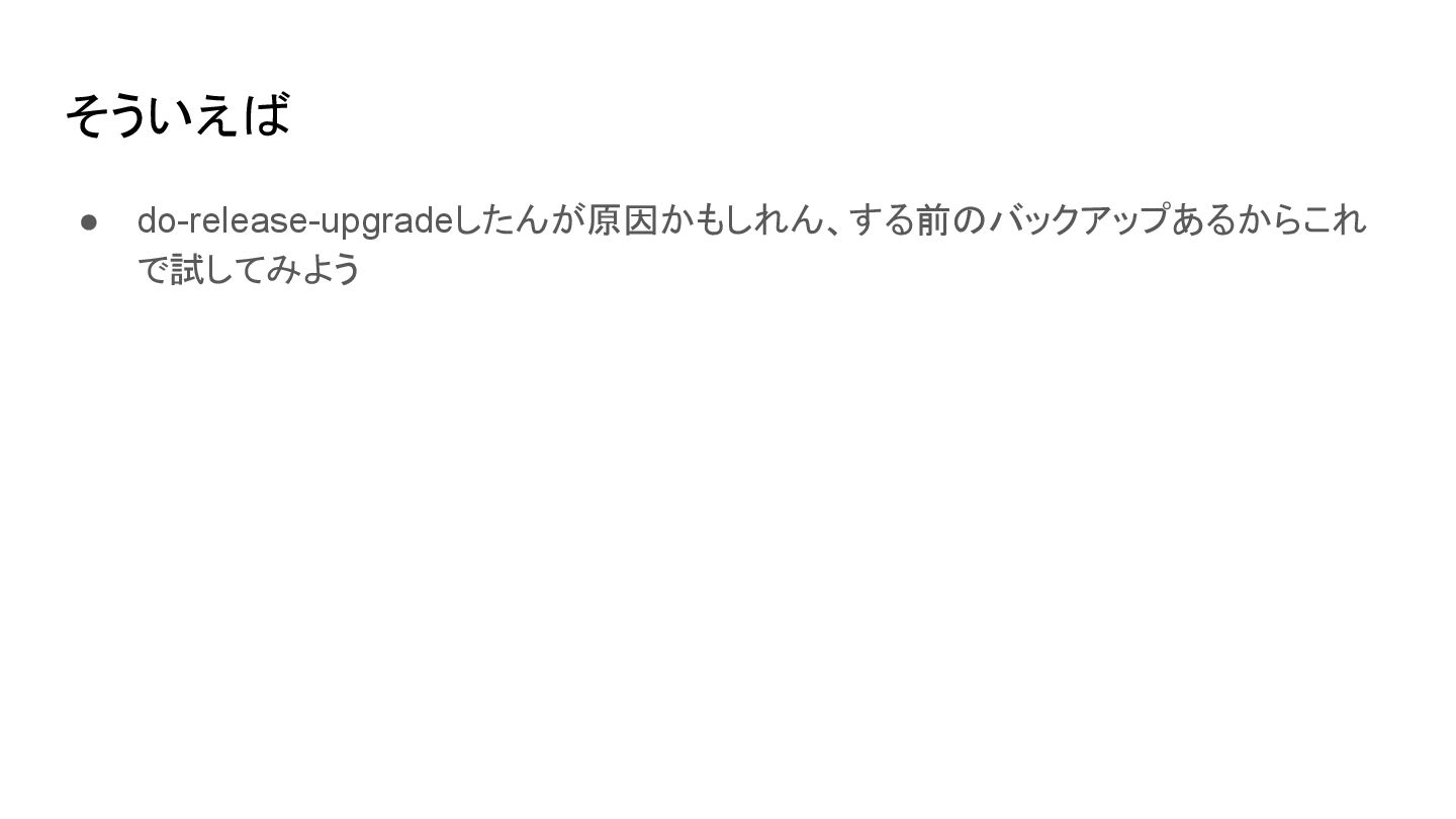 そういえば • do-release-upgradeしたんが原因かもしれん、する前のバックアップあるからこれ で試してみよう