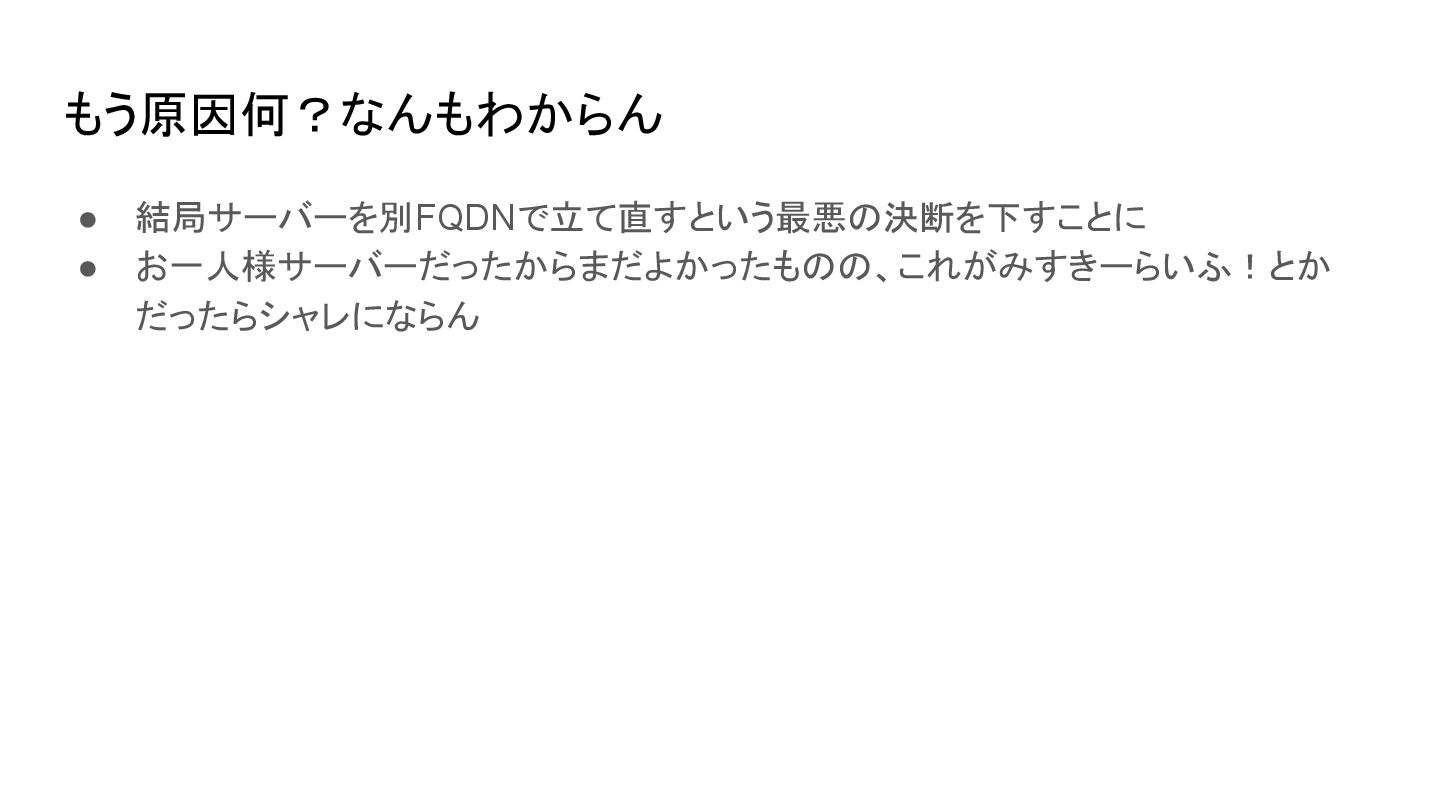 もう原因何?なんもわからん • 結局サーバーを別FQDNで立て直すという最悪の決断を下すことに • お一人様サーバーだったからまだよかったものの、これがみすきーらいふ!とか だったらシャレにならん