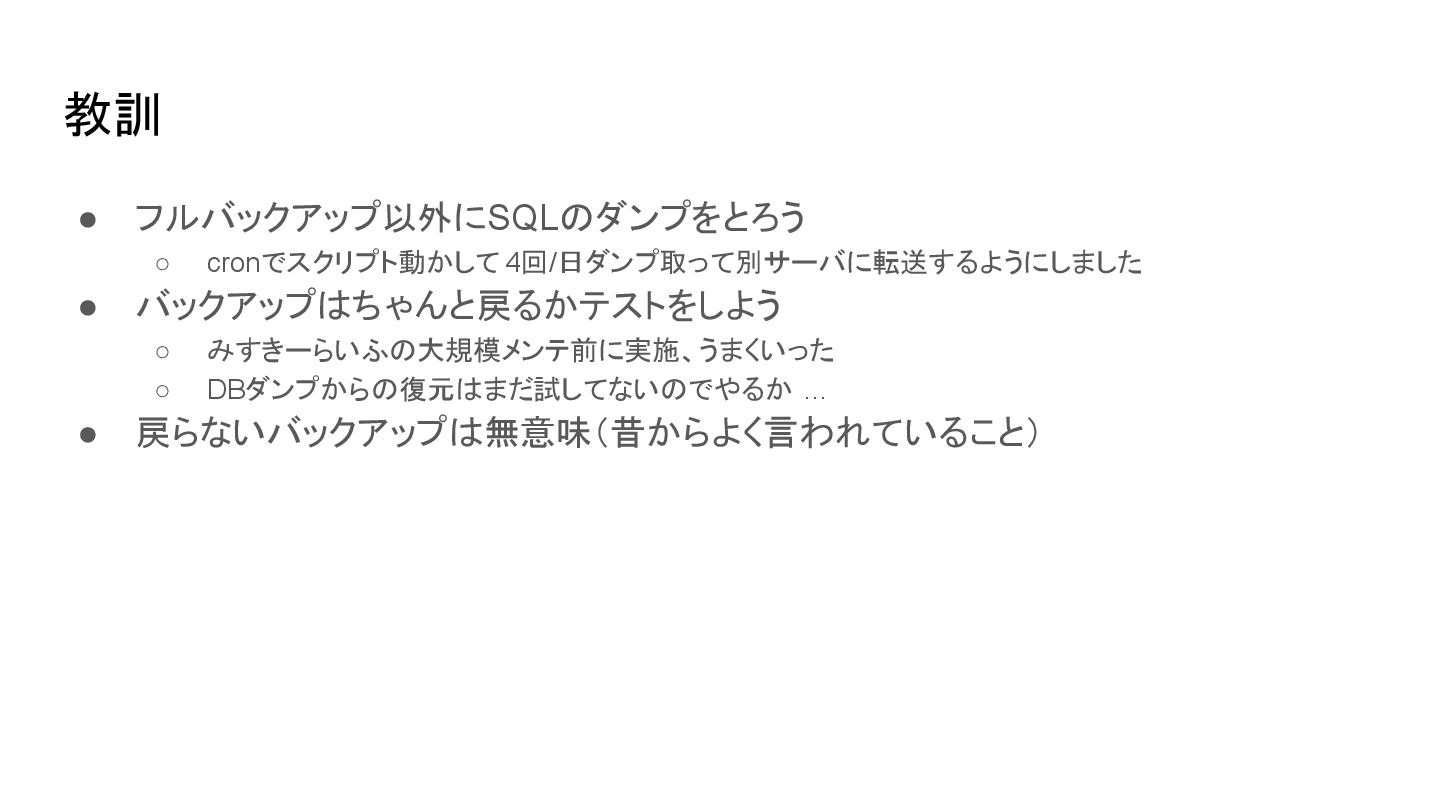 教訓 • フルバックアップ以外にSQLのダンプをとろう ◦ cronでスクリプト動かして 4回/日ダンプ取って別サーバに転送するようにしました • バックアップはちゃんと戻るかテストをしよう ◦ みすきーらいふの大規模メンテ前に実施、うまくいった