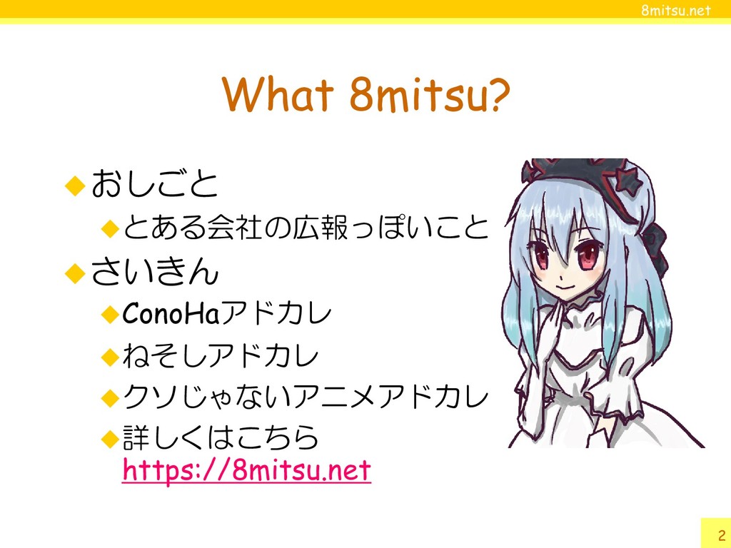 8mitsu.net 2 What 8mitsu? おしごと とある会社の広報っぽいこと さいきん ConoHaアドカレ ねそしアドカレ クソじゃないアニメアドカレ