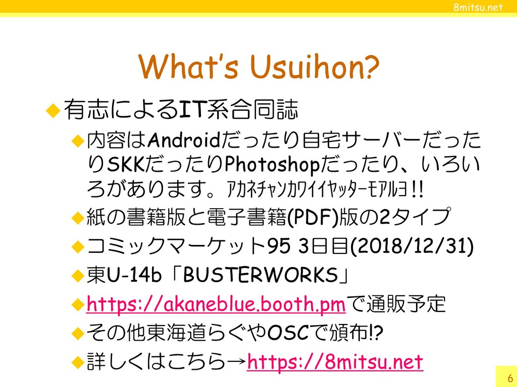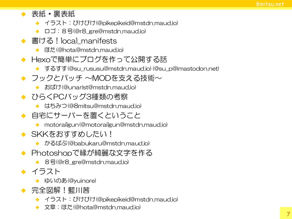 8mitsu.net 6 What’s Usuihon? 有志によるIT系合同誌 内容はAndroidだったり自宅サーバーだった りSKKだったりPhotoshopだったり、いろい ろがあります。アカネチャンカワイイヤッターモアルヨ‼ 紙の書籍版と電子書籍(PDF)版の2タイプ コミックマーケット95