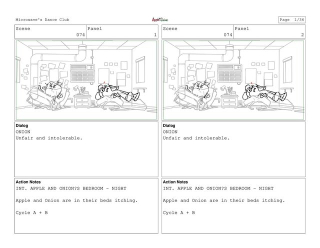 Notes INT. APPLE AND ONION?S BEDROOM - NIGHT Apple and Onion are in their beds itching. Cycle A + B Scene 074 Panel 2 Dialog ONION Unfair and intolerable. Action Notes INT. APPLE AND ONION?S BEDROOM - NIGHT Apple and Onion are in their beds itching. Cycle A + B Microwave's Dance Club Page 1/36