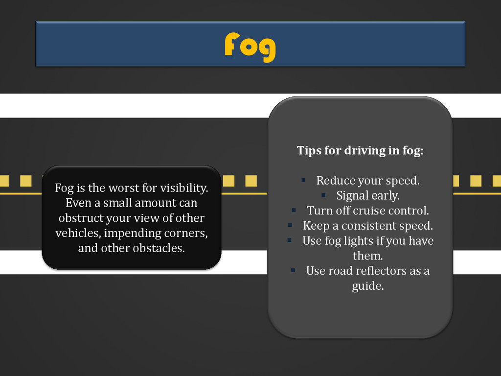 amount can obstruct your view of other vehicles, impending corners, and other obstacles. Tips for driving in fog: Reduce your speed. Signal early. Turn off cruise control. Keep a consistent speed. Use fog lights if you have them. Use road reflectors as a guide.