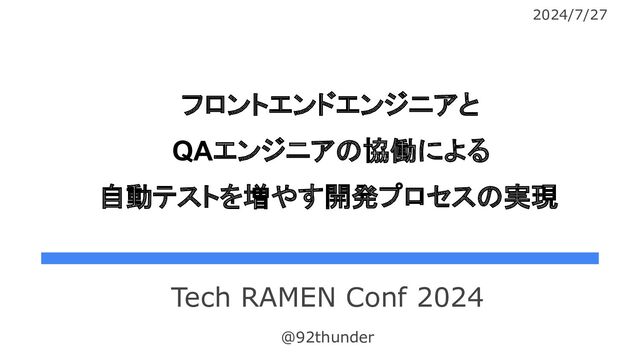 フロントエンドエンジニアと QAエンジニアの協働による 自動テストを増やす開発プロセスの実現 Tech RAMEN Conf 2024 @92thunder 2024/7/27
