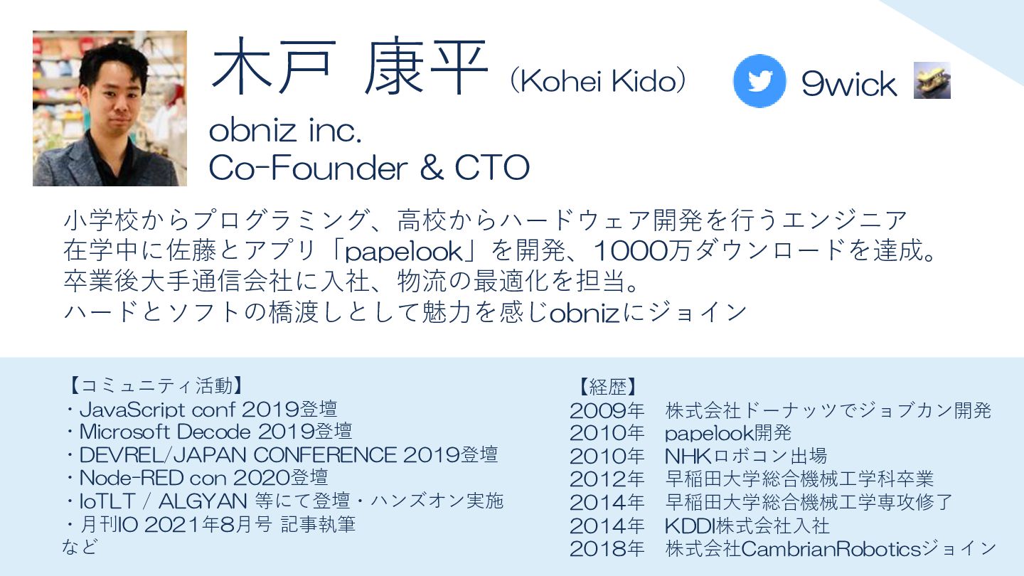 【経歴】 2009年 株式会社ドーナッツでジョブカン開発 2010年 papelook開発 2010年 NHKロボコン出場 2012年 早稲田大学総合機械工学科卒業 2014年 早稲田大学総合機械工学専攻修了 2014年 KDDI株式会社入社 2018年 株式会社CambrianRoboticsジョイン 【コミュニティ活動】 ・JavaScript conf 2019登壇 ・Microsoft Decode 2019登壇 ・DEVREL/JAPAN CONFERENCE 2019登壇 ・Node-RED con 2020登壇 ・IoTLT / ALGYAN 等にて登壇・ハンズオン実施 ・月刊IO 2021年8月号 記事執筆 など 小学校からプログラミング、高校からハードウェア開発を行うエンジニア 在学中に佐藤とアプリ「papelook」を開発、1000万ダウンロードを達成。 卒業後大手通信会社に入社、物流の最適化を担当。 ハードとソフトの橋渡しとして魅力を感じobnizにジョイン