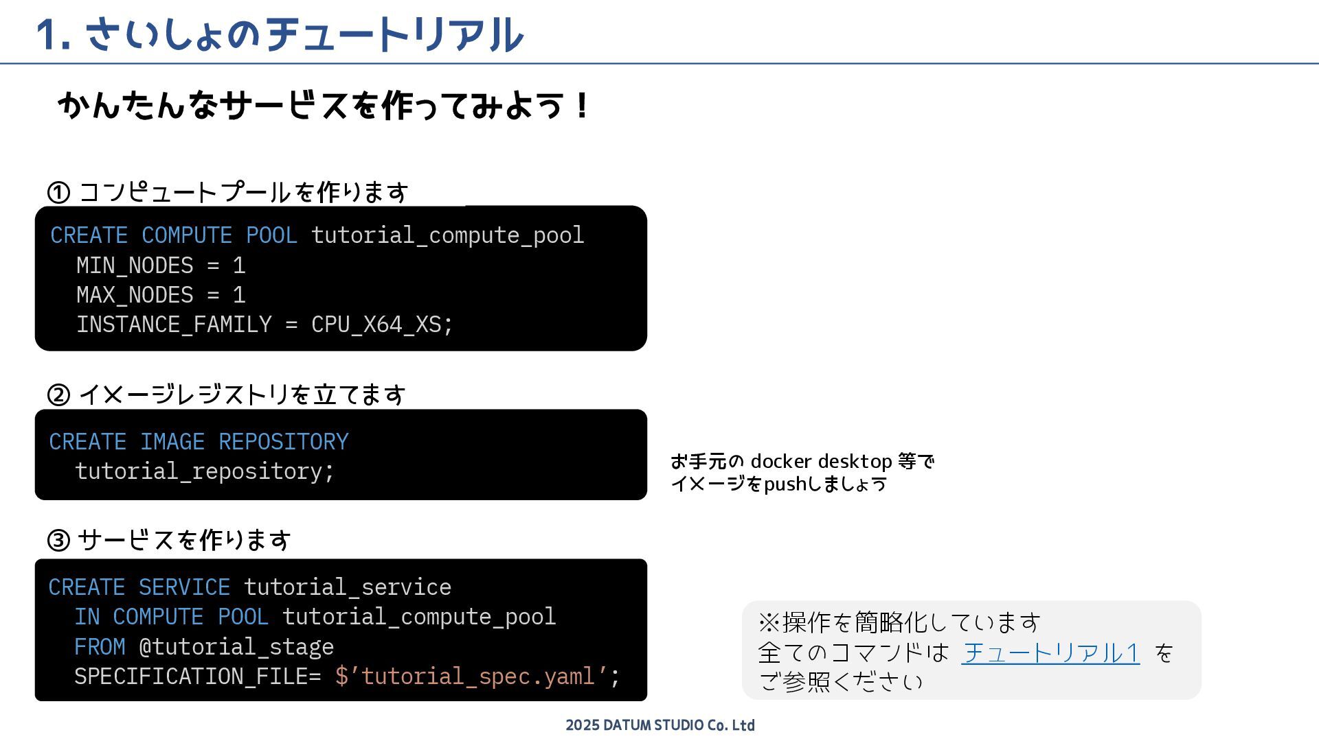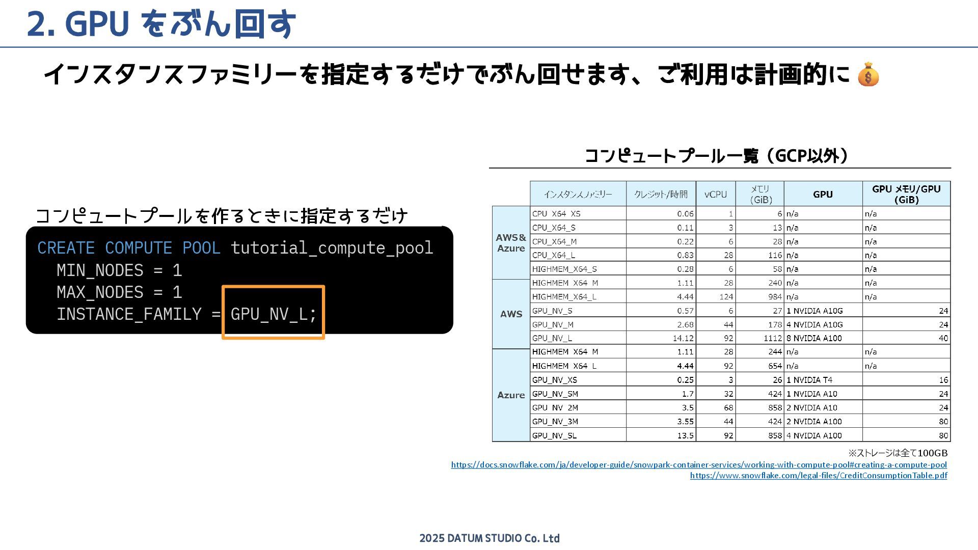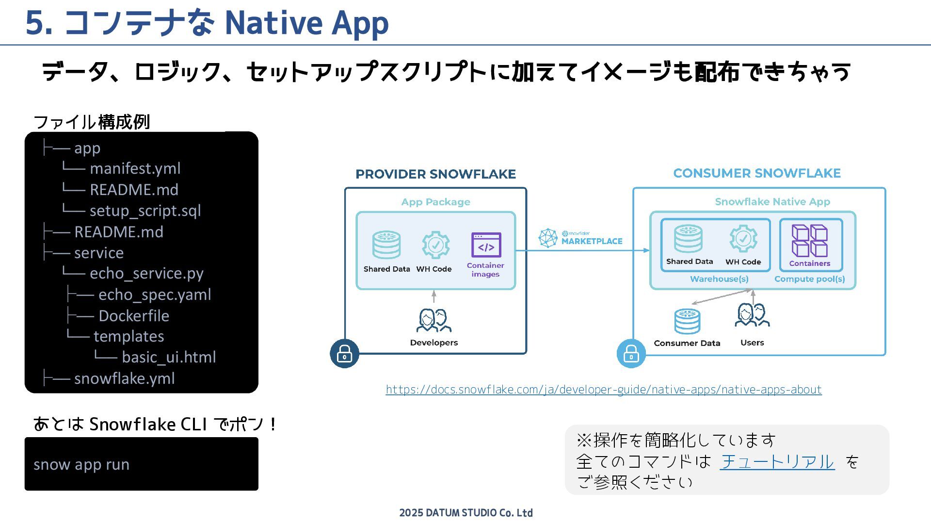 SPCS) は、Snowflake で簡単にコンテナアプリ ケーションを運用するために設計されたフルマネージドなコンテナサービスです。 ✓ Snowflake アカウント内でコンテナアプリケーションを実行する、 フルマネージドコンテナサービス ✓ 任意の言語で作成したアプリケーションをSnowflakeに持ち込め る(例:C/C++、Node.js、Python、Rなど) ✓ 使い慣れたSQLやPython API、CLIでデプロイや実行などの操作 が可能 ✓ vCPU数・メモリが小さく低コストなインスタンスから、強力な GPU搭載インスタンスまで、用途に合わせて選択可能 引用:https://www.snowflake.com/en/blog/snowpark-container-services-deploy-genai-full-stack-apps/ 特徴③Native Appsとの統合 ✓ 任意の言語で書かれたアプリケーションをマーケットプレイス で配布・入手可能 特徴②学習コストが低く、手がかからない ✓ アプリケーションの構成はyamlで記述するだけ ✓ コンテナ環境のネットワーク等の構成、セキュリティ設定など は自動的に行われ、ユーザーはアプリケーションの開発に専念 できる 特徴①Snowflakeのデータをセキュアに扱える ✓ アプリケーションは Snowflake 環境内で実行される ✓ Snowflake のデータをアプリケーションで扱うために、データ をSnowflake外に出す必要がない SPCSとは 引用: https://docs.getdbt.com/docs/cl oud-integrations/set-up- snowflake-native-app