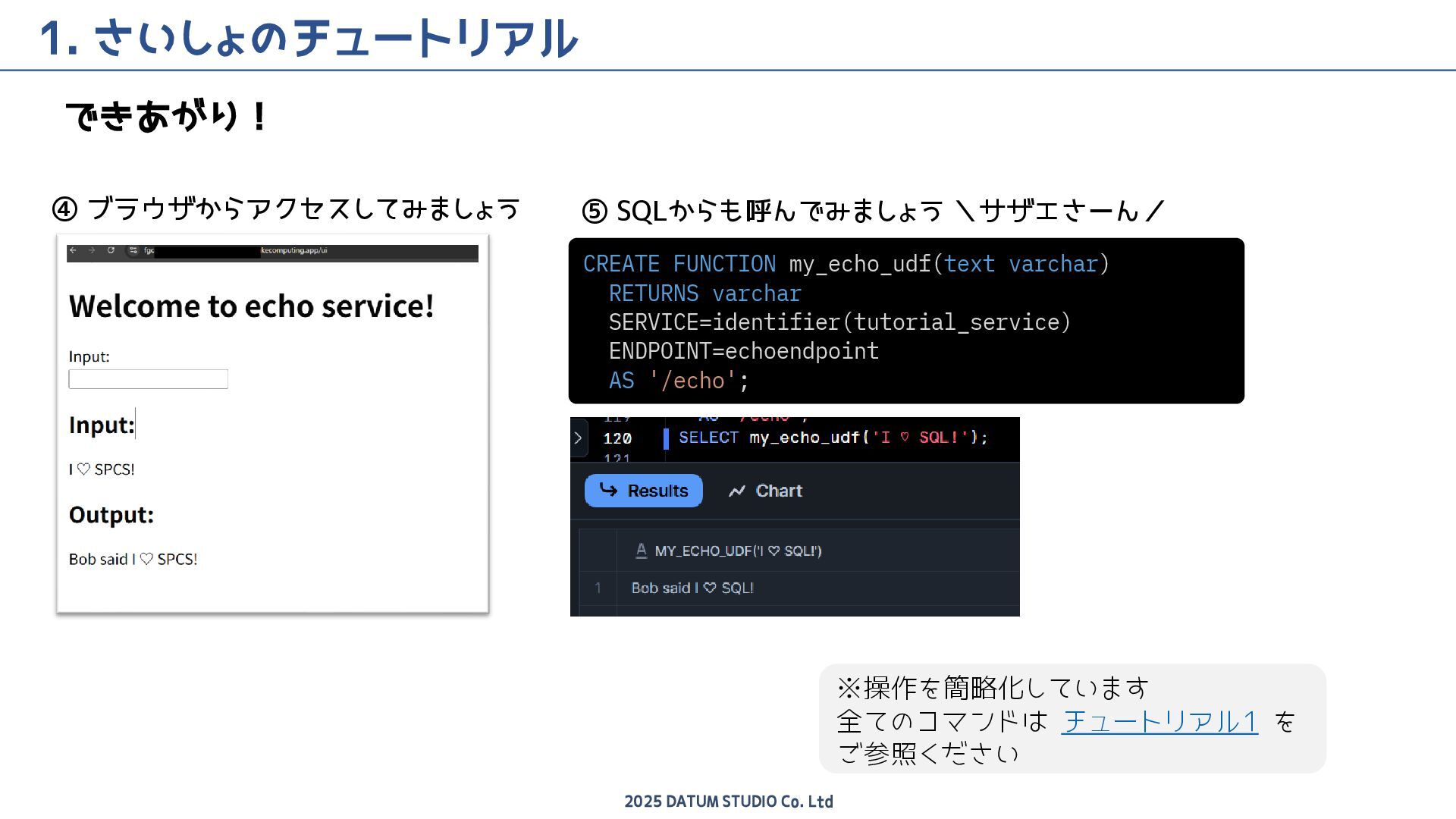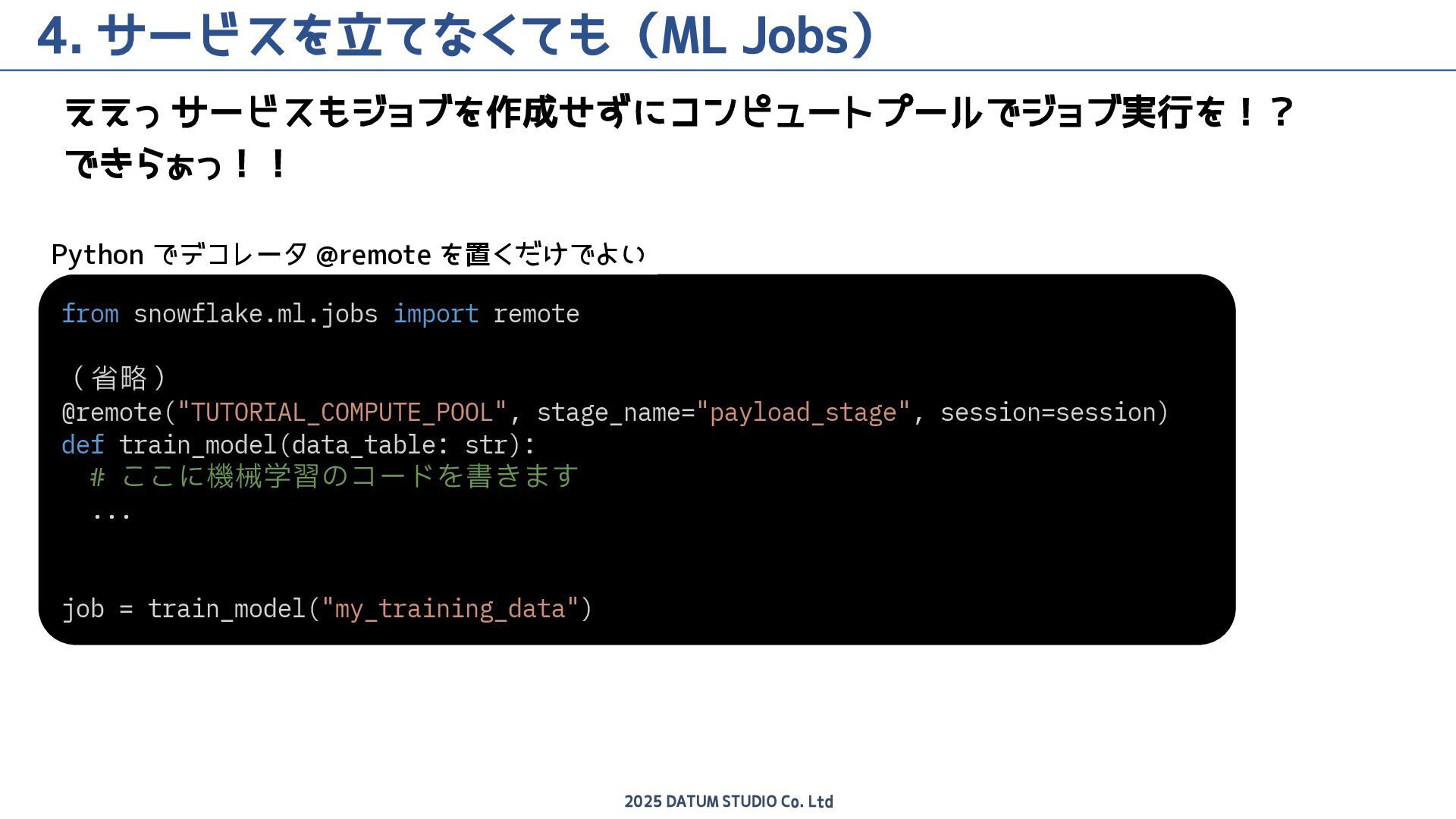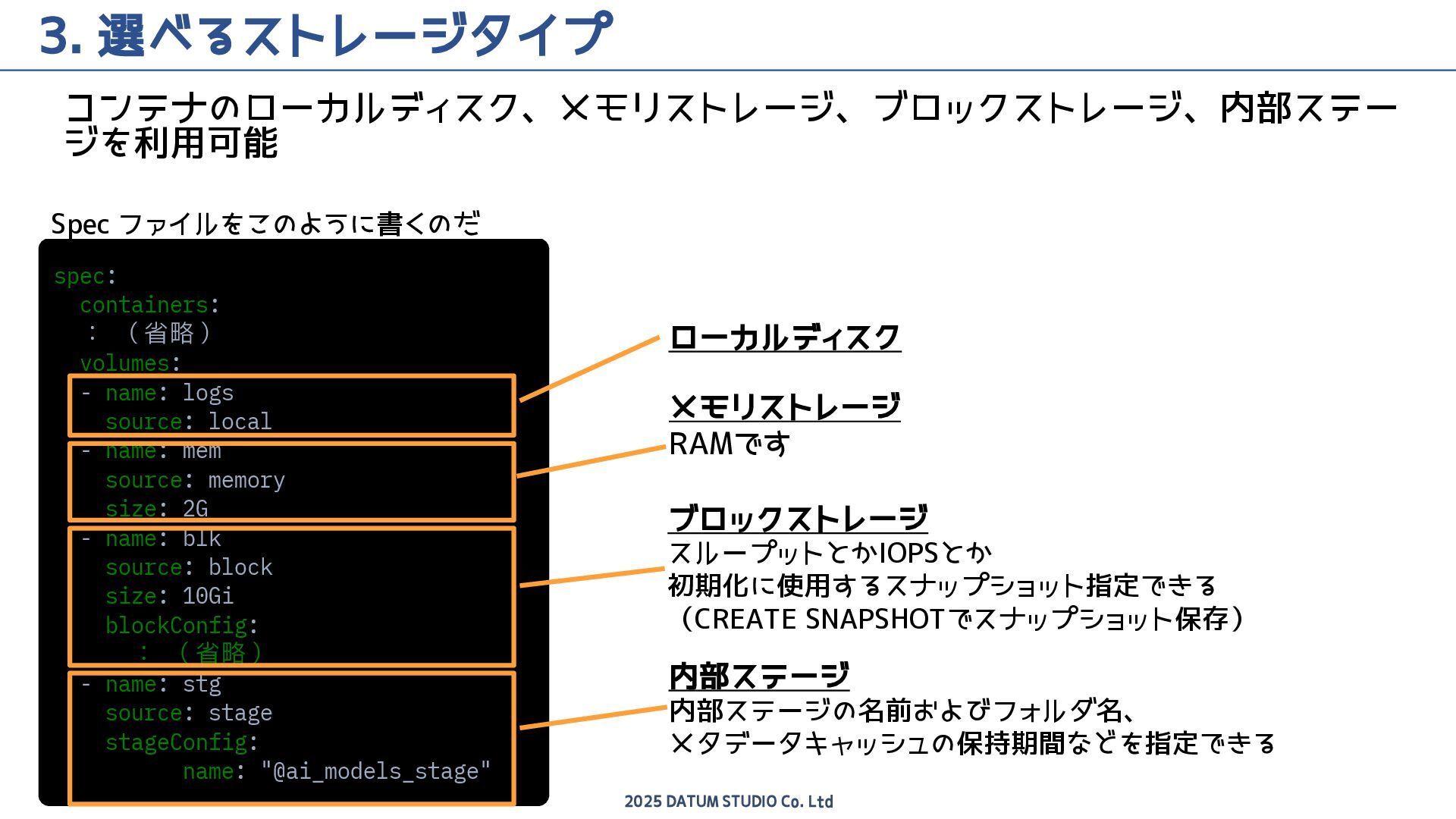 SPCS) は、Snowflake で簡単にコンテナアプリ ケーションを運用するために設計されたフルマネージドなコンテナサービスです。 ✓ Snowflake アカウント内でコンテナアプリケーションを実行する、 フルマネージドコンテナサービス ✓ 任意の言語で作成したアプリケーションをSnowflakeに持ち込め る(例:C/C++、Node.js、Python、Rなど) ✓ 使い慣れたSQLやPython API、CLIでデプロイや実行などの操作 が可能 ✓ vCPU数・メモリが小さく低コストなインスタンスから、強力な GPU搭載インスタンスまで、用途に合わせて選択可能 引用:https://www.snowflake.com/en/blog/snowpark-container-services-deploy-genai-full-stack-apps/ 特徴③Native Appsとの統合 ✓ 任意の言語で書かれたアプリケーションをマーケットプレイス で配布・入手可能 特徴②学習コストが低く、手がかからない ✓ アプリケーションの構成はyamlで記述するだけ ✓ コンテナ環境のネットワーク等の構成、セキュリティ設定など は自動的に行われ、ユーザーはアプリケーションの開発に専念 できる 特徴①Snowflakeのデータをセキュアに扱える ✓ アプリケーションは Snowflake 環境内で実行される ✓ Snowflake のデータをアプリケーションで扱うために、データ をSnowflake外に出す必要がない SPCSとは 引用: https://docs.getdbt.com/docs/cl oud-integrations/set-up- snowflake-native-app