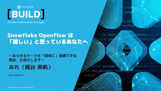 Openflow で繋がる Snowflake BULD 2025 「Building AI-Powered Pipelines: A Deep Dive into Snowflake Openflow with Unstructured Data」より https://www.snowflake.com/en/build/americas/agenda?agendaPath=session/1763437