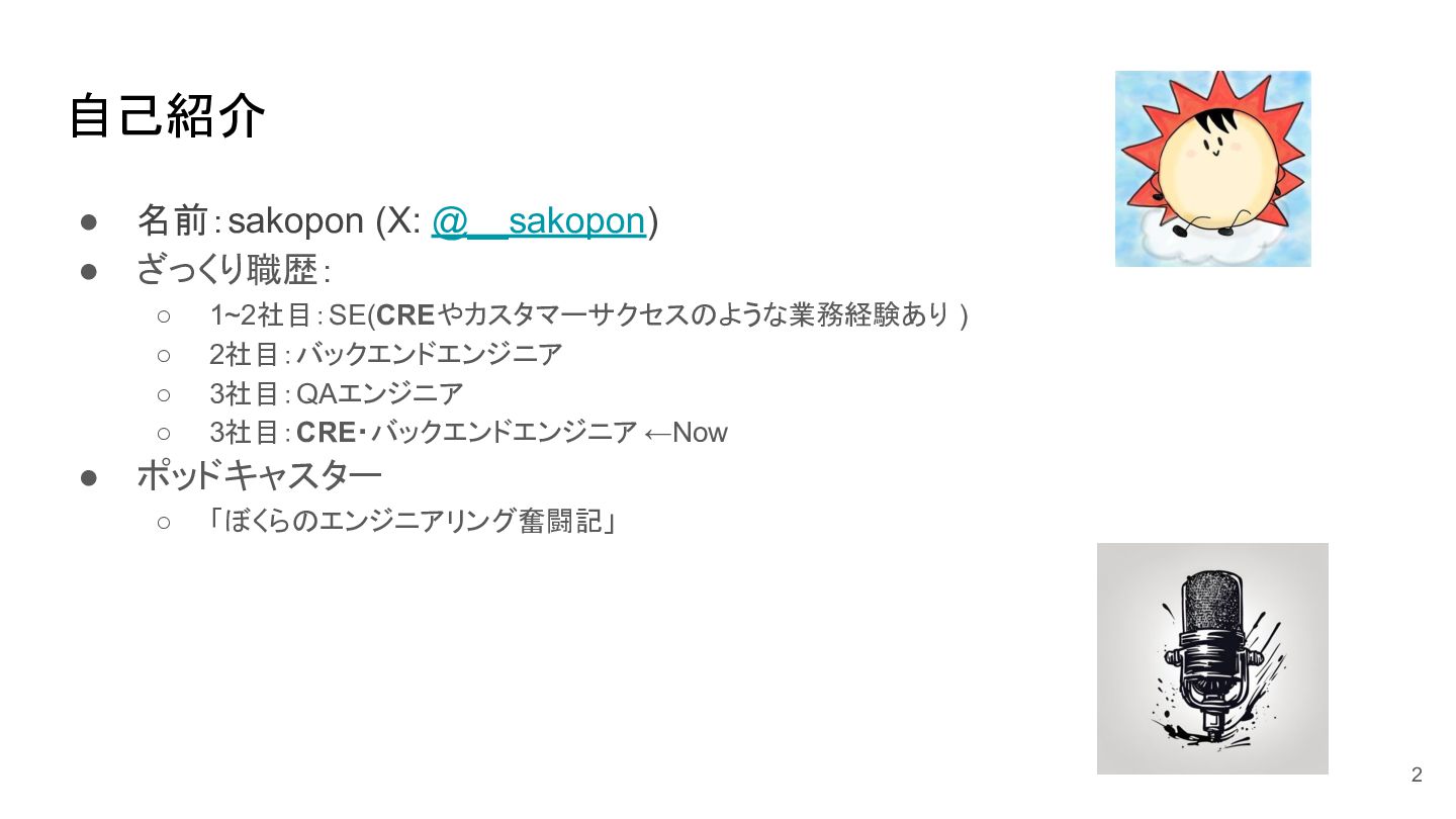 2社目:バックエンドエンジニア ◦ 3社目:QAエンジニア ◦ 3社目:CRE・バックエンドエンジニア ←Now • ポッドキャスター ◦ 「ぼくらのエンジニアリング奮闘記」 自己紹介 2