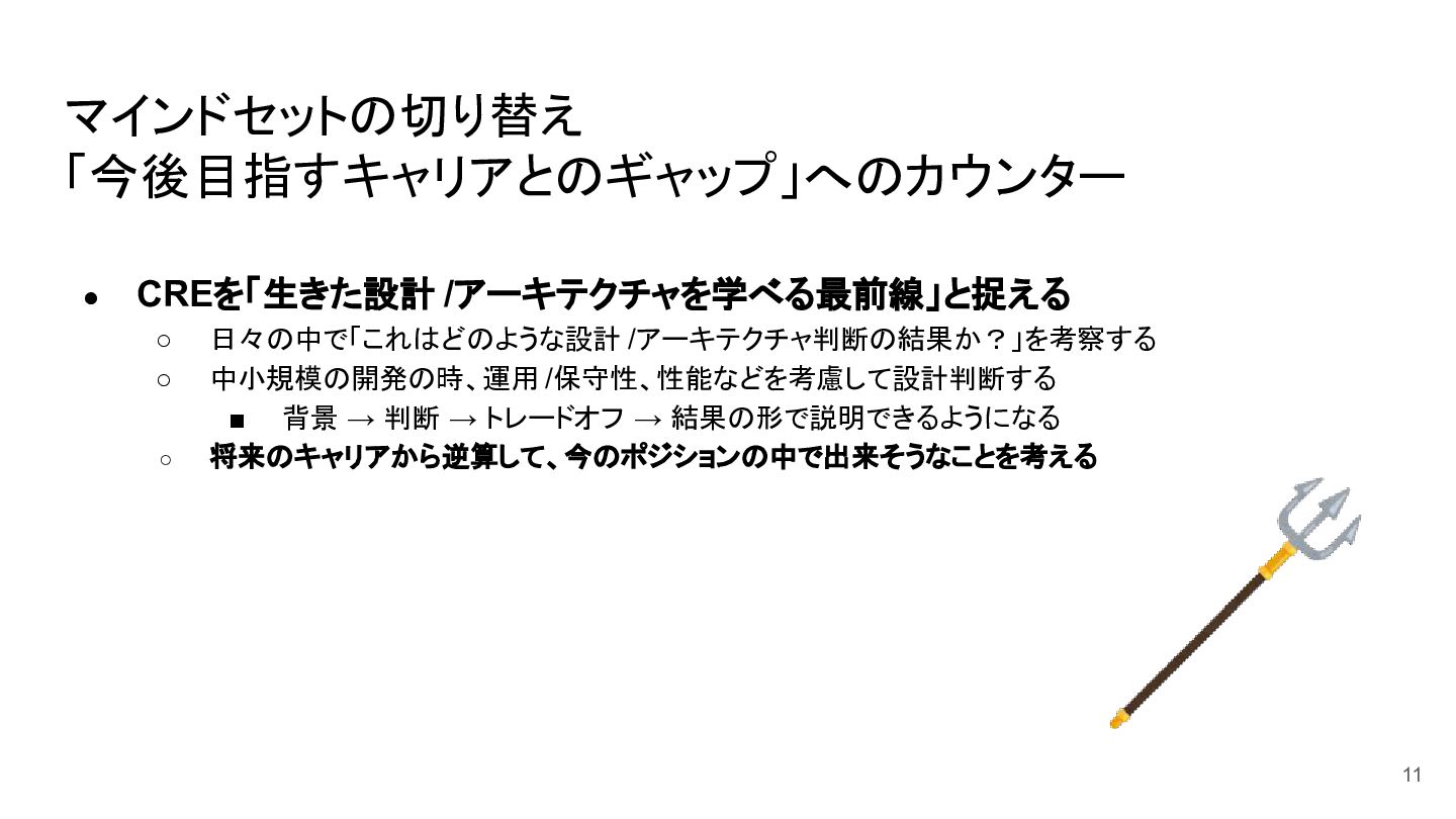 マインドセットの切り替え 「今後目指すキャリアとのギャップ」へのカウンター • CREを「生きた設計 /アーキテクチャを学べる最前線」と捉える ◦ 日々の中で「これはどのような設計 /アーキテクチャ判断の結果か?」を考察する ◦ 中小規模の開発の時、運用