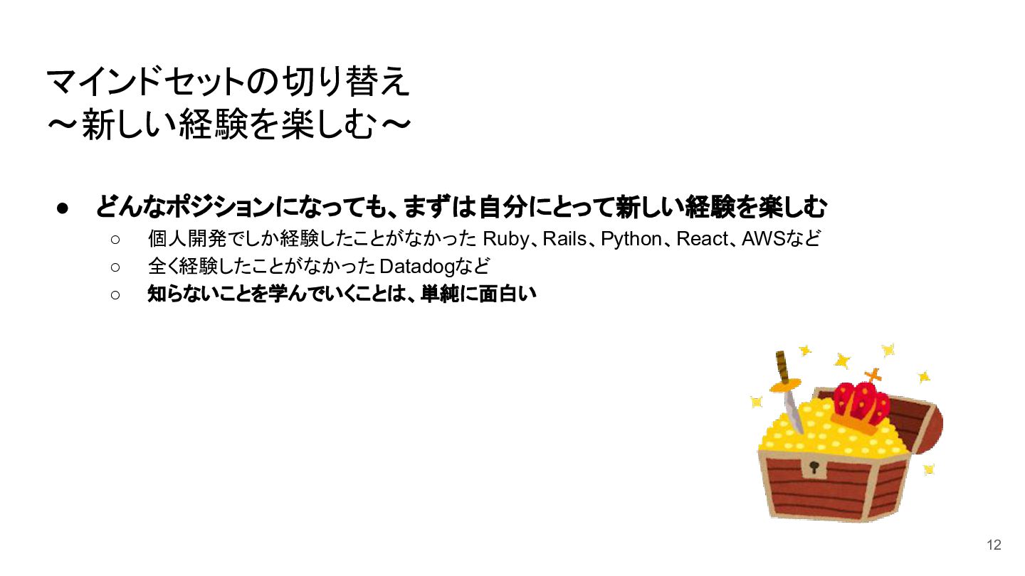 マインドセットの切り替え ~新しい経験を楽しむ~ • どんなポジションになっても、まずは自分にとって新しい経験を楽しむ ◦ 個人開発でしか経験したことがなかった Ruby、Rails、Python、React、AWSなど ◦ 全く経験したことがなかった Datadogなど
