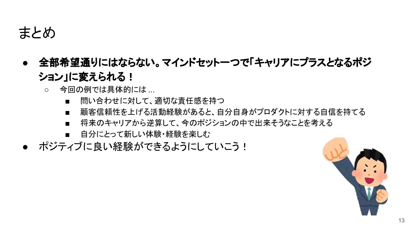 まとめ • 全部希望通りにはならない。マインドセット一つで「キャリアにプラスとなるポジ ション」に変えられる! ◦ 今回の例では具体的には ... ▪ 問い合わせに対して、適切な責任感を持つ ▪