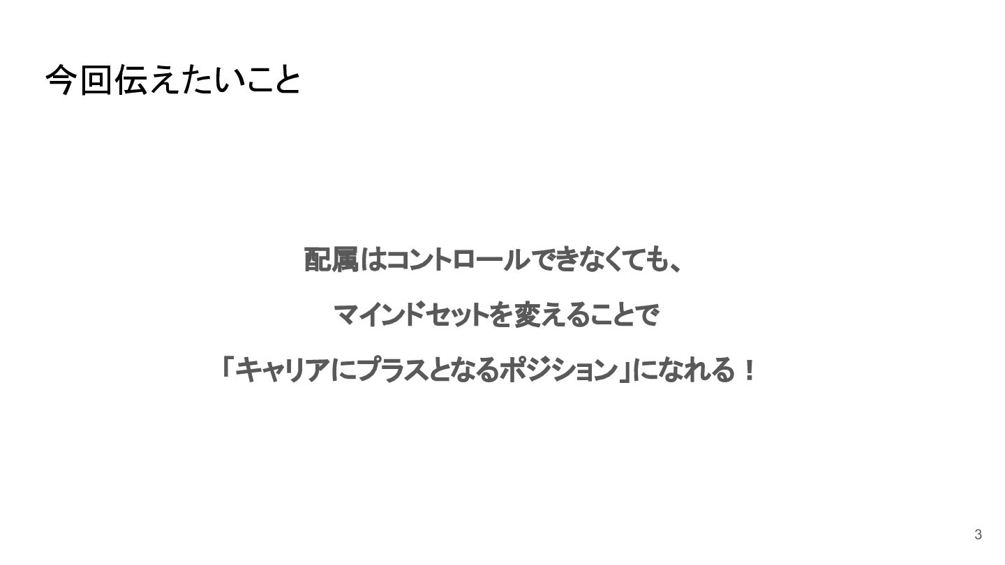 今回伝えたいこと 配属はコントロールできなくても、 マインドセットを変えることで 「キャリアにプラスとなるポジション」になれる! 3