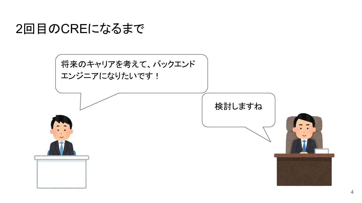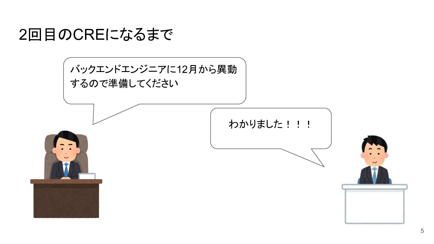 2回目のCREになるまで バックエンドエンジニアに12月から異動 するので準備してください わかりました!!! 5