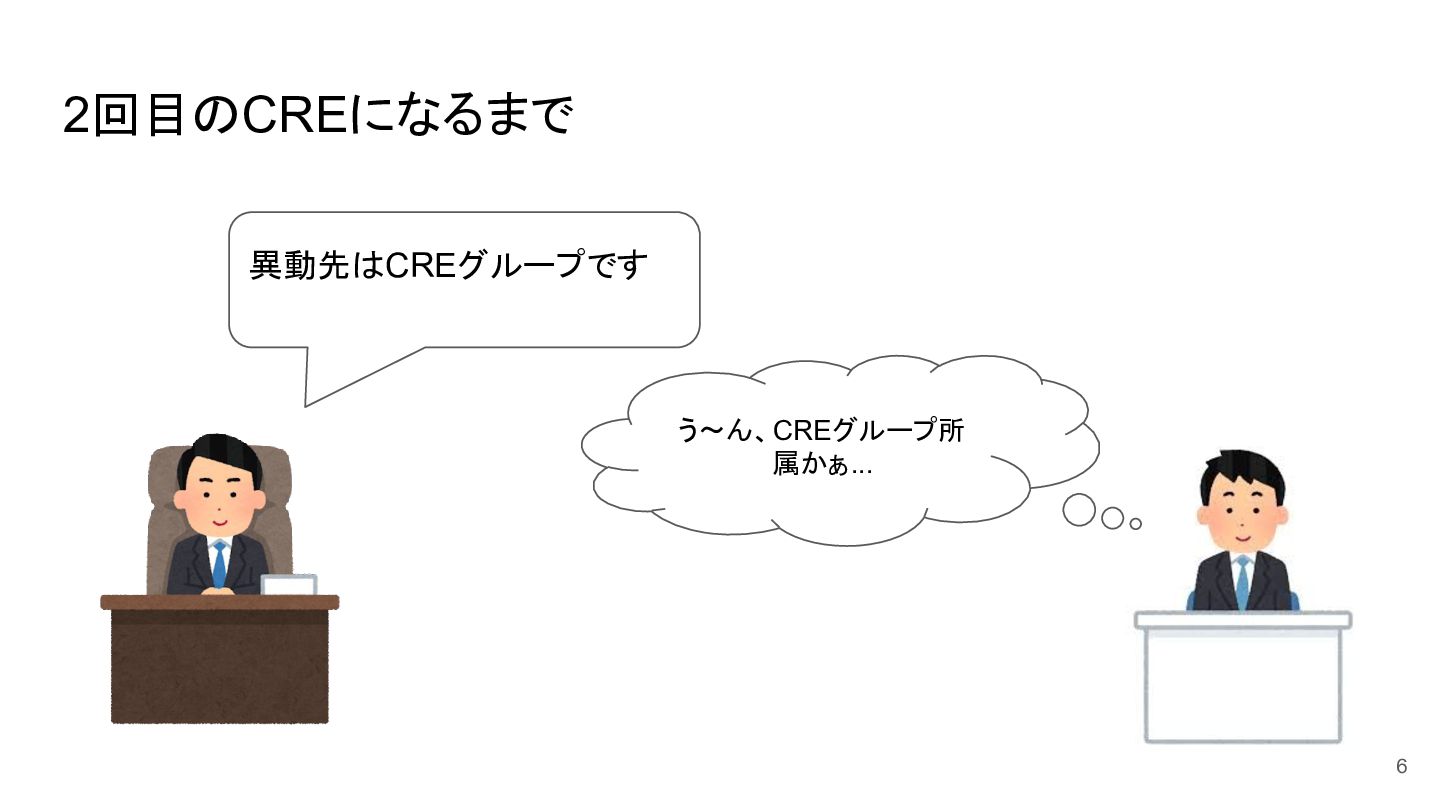 2回目のCREになるまで 異動先はCREグループです う~ん、CREグループ所 属かぁ... 6