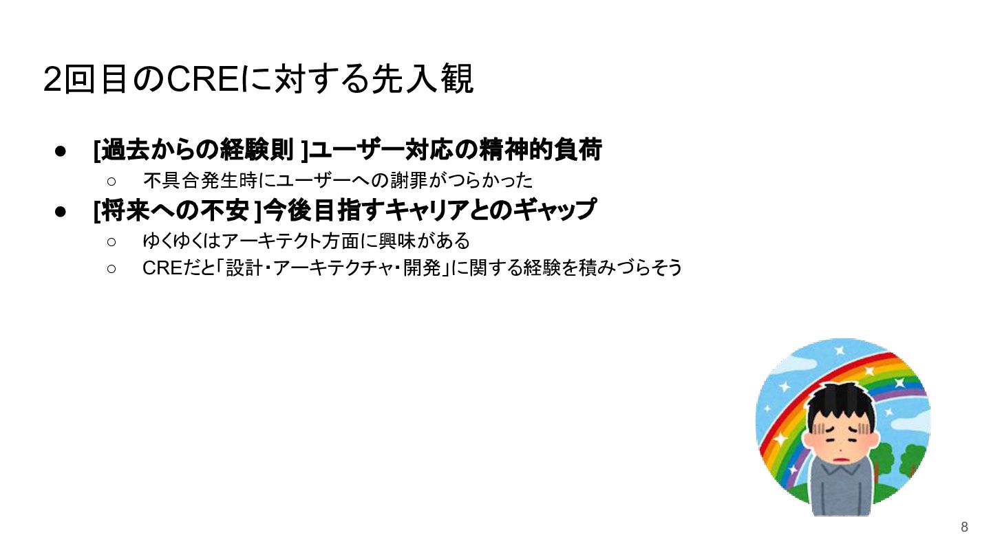 2回目のCREに対する先入観 • [過去からの経験則 ]ユーザー対応の精神的負荷 ◦ 不具合発生時にユーザーへの謝罪がつらかった • [将来への不安 ]今後目指すキャリアとのギャップ ◦