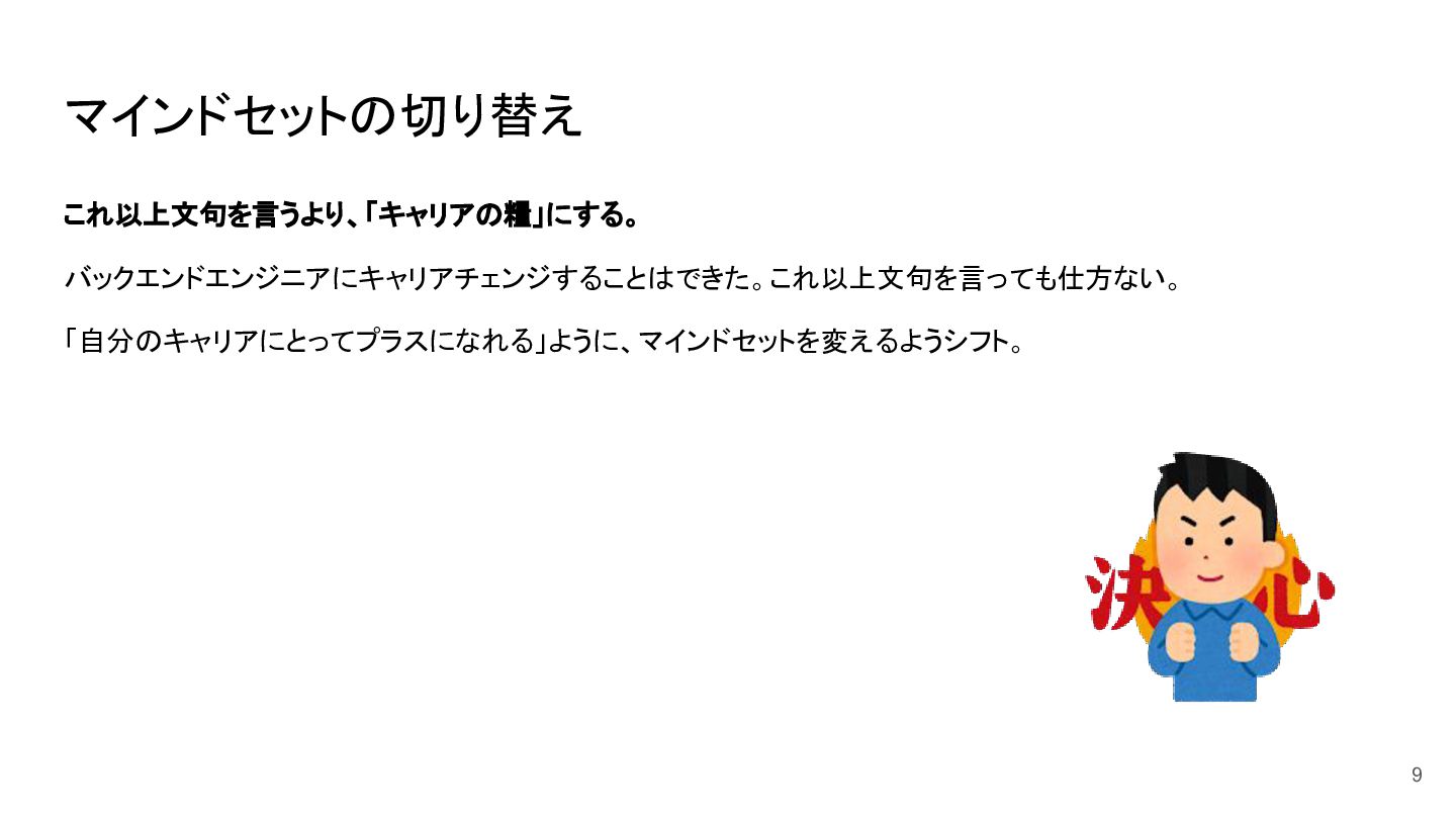 マインドセットの切り替え これ以上文句を言うより、「キャリアの糧」にする。 バックエンドエンジニアにキャリアチェンジすることはできた。これ以上文句を言っても仕方ない。 「自分のキャリアにとってプラスになれる」ように、マインドセットを変えるようシフト。 9