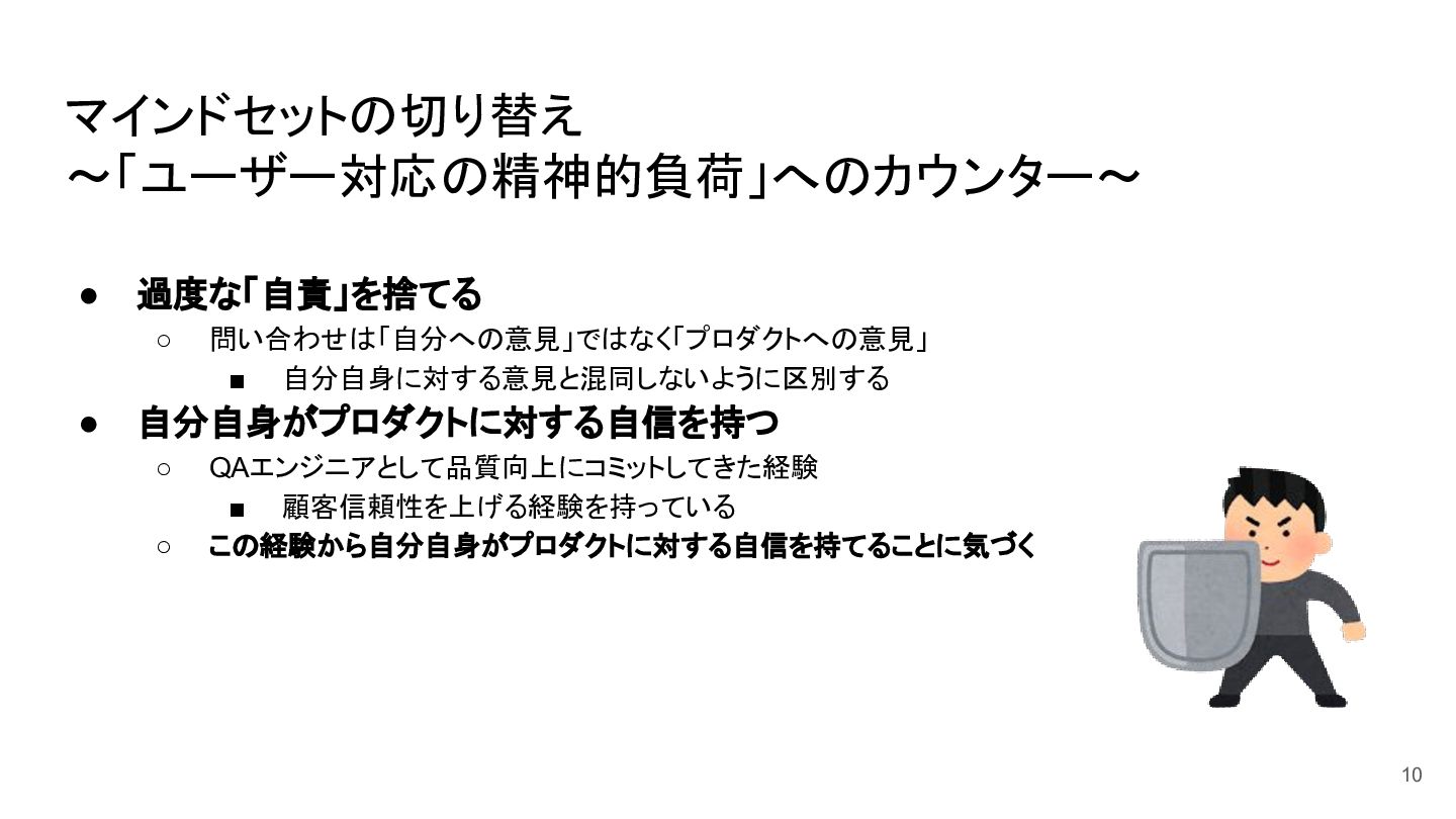 マインドセットの切り替え ~「ユーザー対応の精神的負荷」へのカウンター~ • 過度な「自責」を捨てる ◦ 問い合わせは「自分への意見」ではなく「プロダクトへの意見」 ▪ 自分自身に対する意見と混同しないように区別する • 自分自身がプロダクトに対する自信を持つ