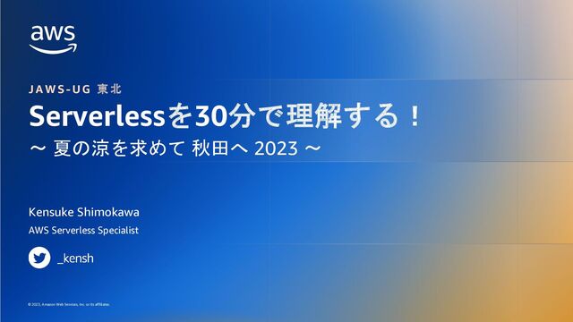 2023, Amazon Web Services, Inc. or its affiliates. Serverlessを30分で理解する! 〜 夏の涼を求めて 秋田へ 2023 〜 Kensuke Shimokawa J A W S - U G 東 北 AWS Serverless Specialist