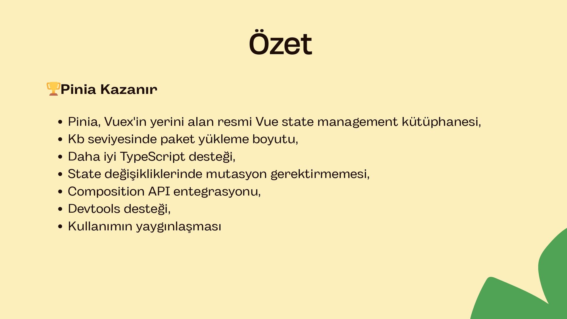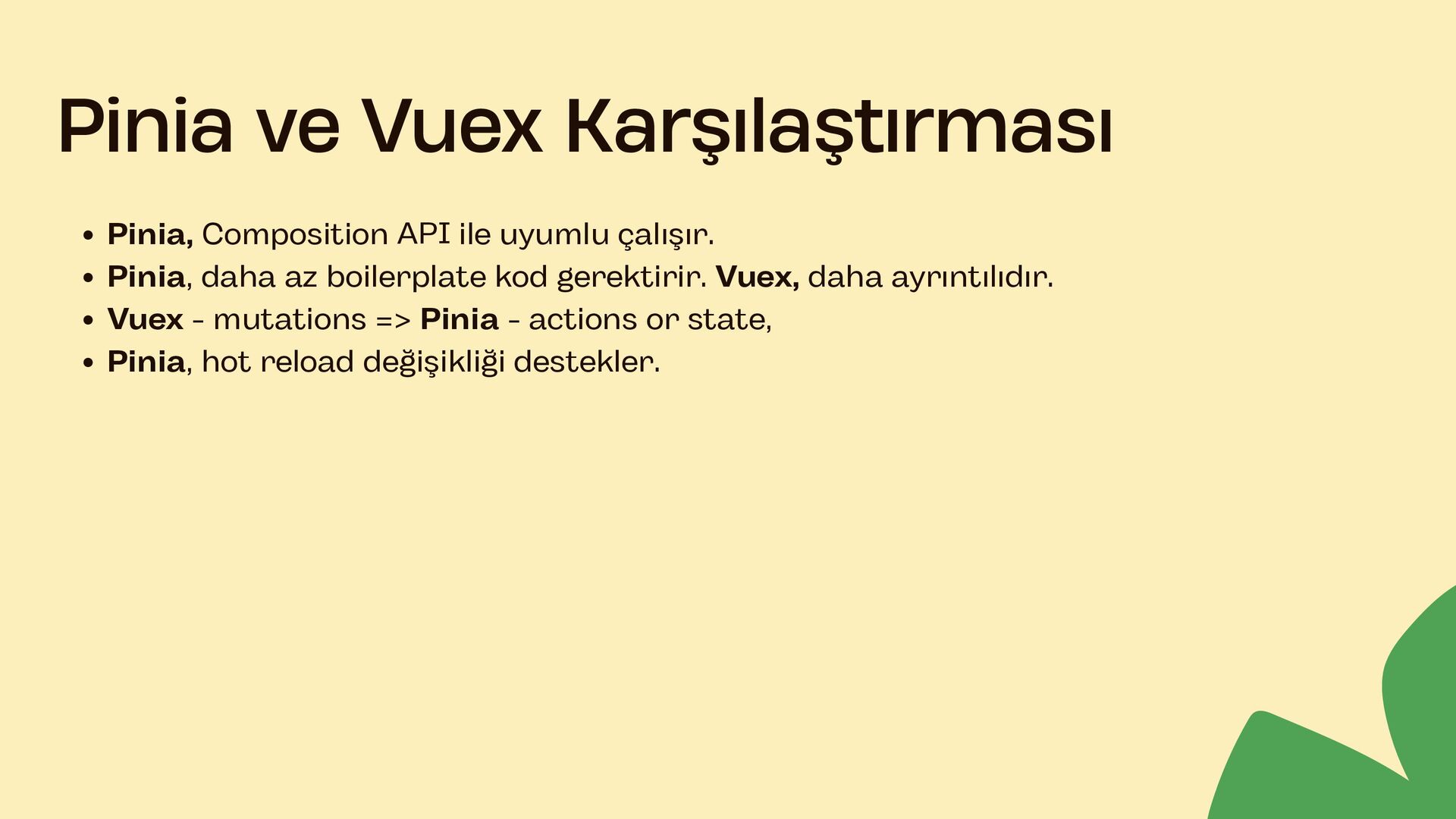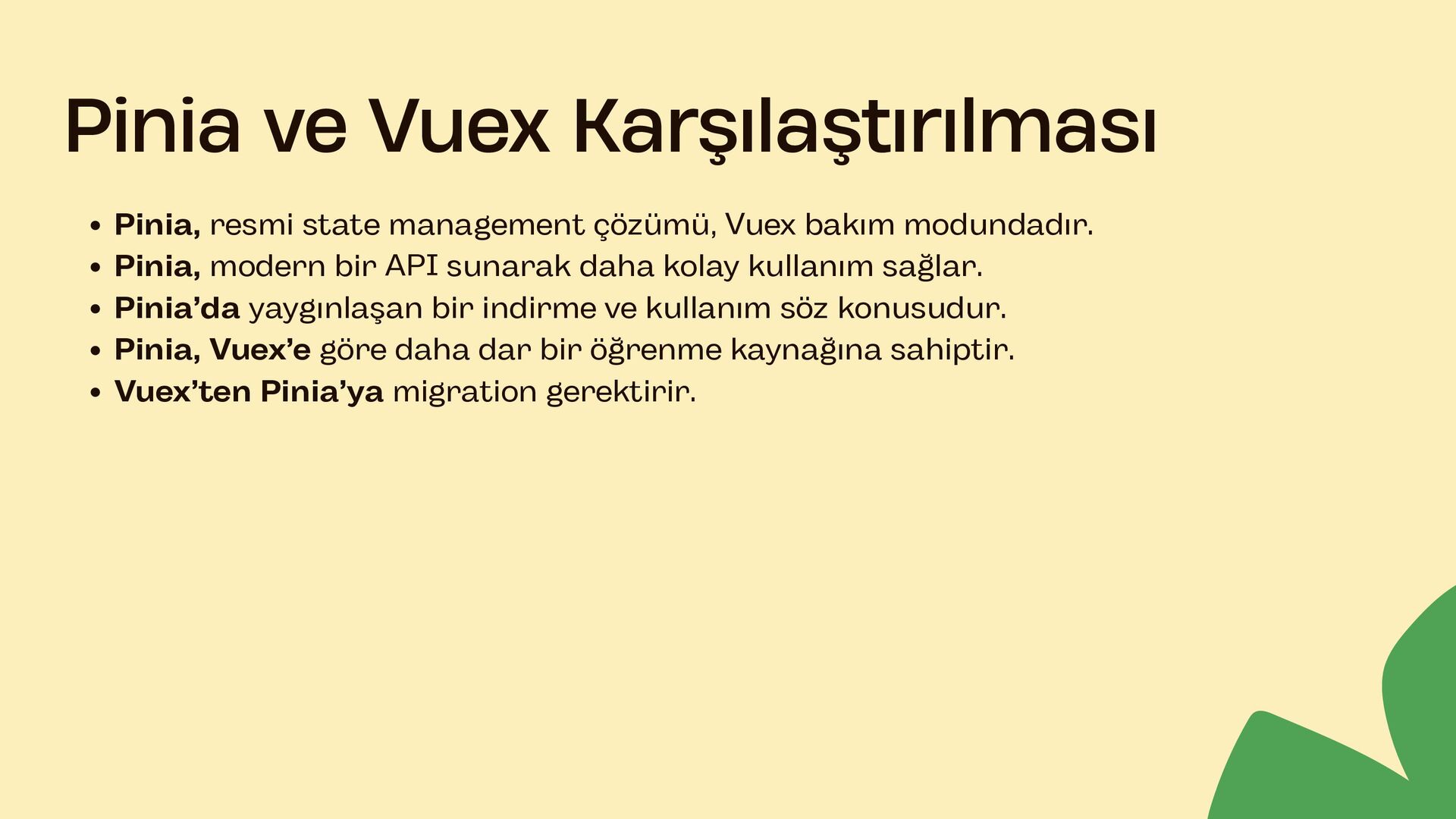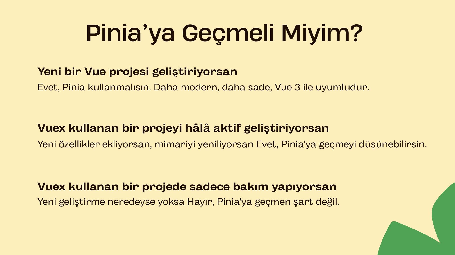 kullanmalısın. Daha modern, daha sade, Vue 3 ile uyumludur. Vuex kullanan bir projeyi hâlâ aktif geliştiriyorsan Yeni özellikler ekliyorsan, mimariyi yeniliyorsan Evet, Pinia'ya geçmeyi düşünebilirsin. Vuex kullanan bir projede sadece bakım yapıyorsan Yeni geliştirme neredeyse yoksa Hayır, Pinia'ya geçmen şart değil.