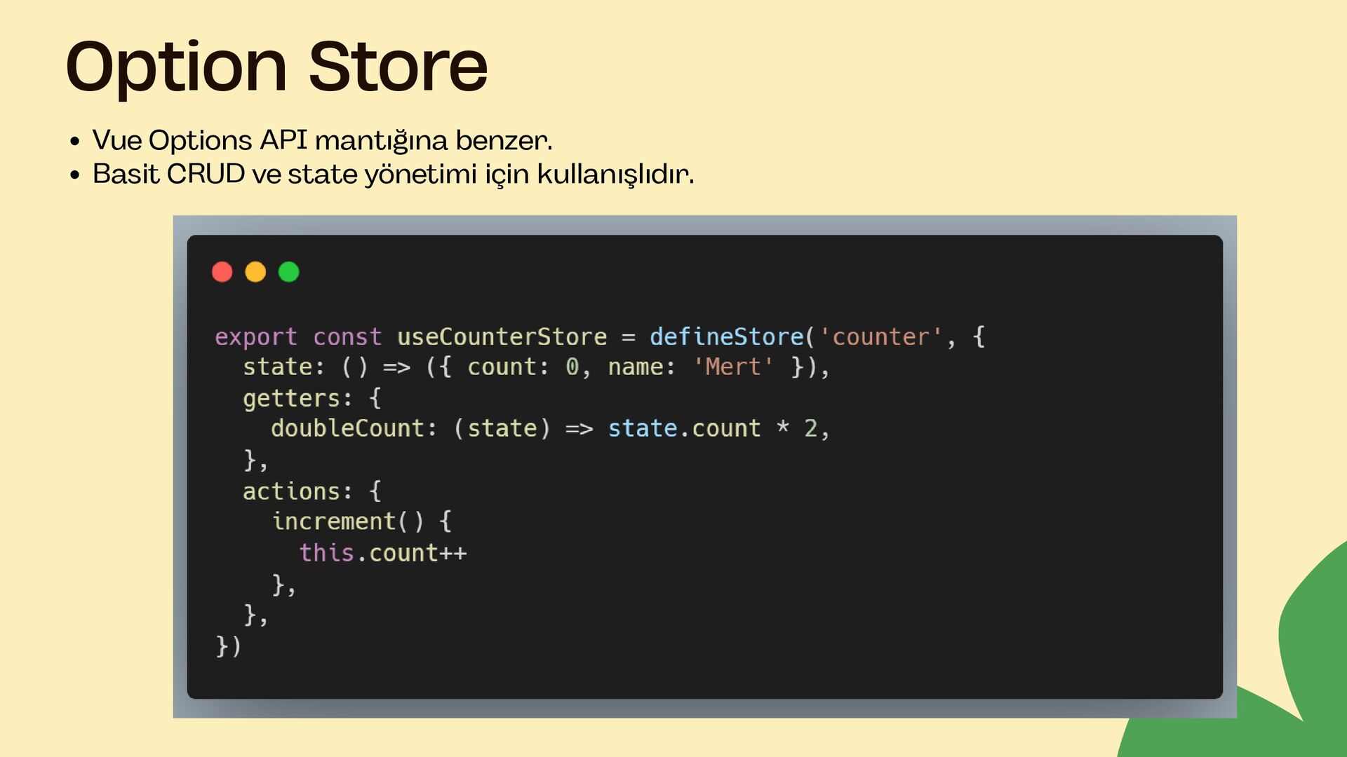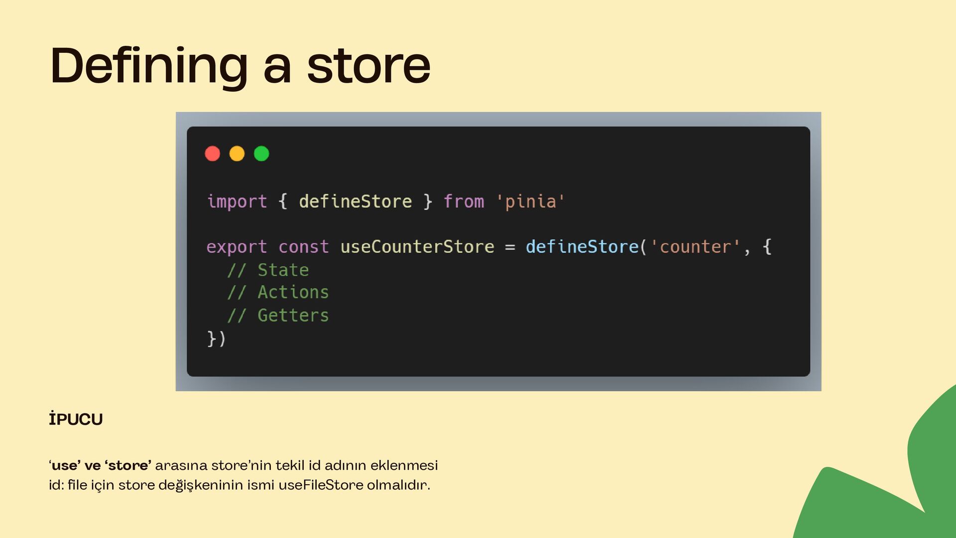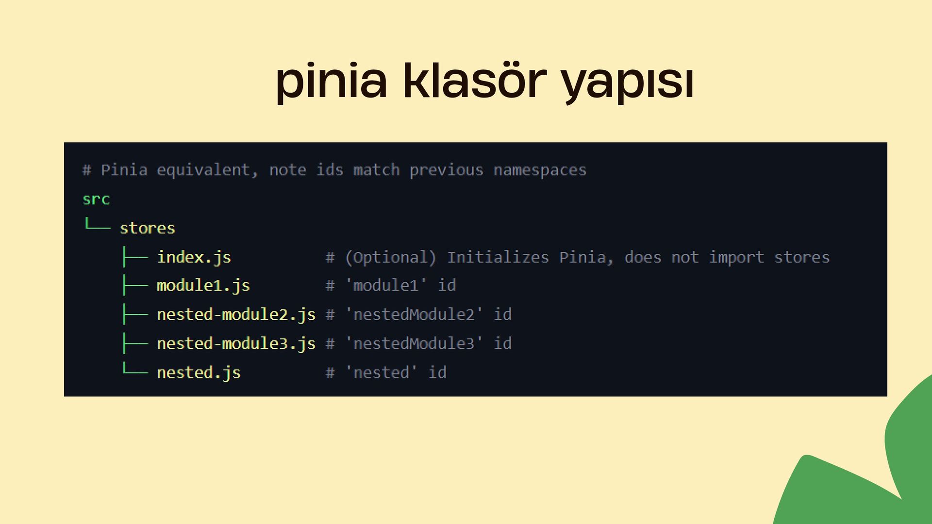 kullanmalısın. Daha modern, daha sade, Vue 3 ile uyumludur. Vuex kullanan bir projeyi hâlâ aktif geliştiriyorsan Yeni özellikler ekliyorsan, mimariyi yeniliyorsan Evet, Pinia'ya geçmeyi düşünebilirsin. Vuex kullanan bir projede sadece bakım yapıyorsan Yeni geliştirme neredeyse yoksa Hayır, Pinia'ya geçmen şart değil.