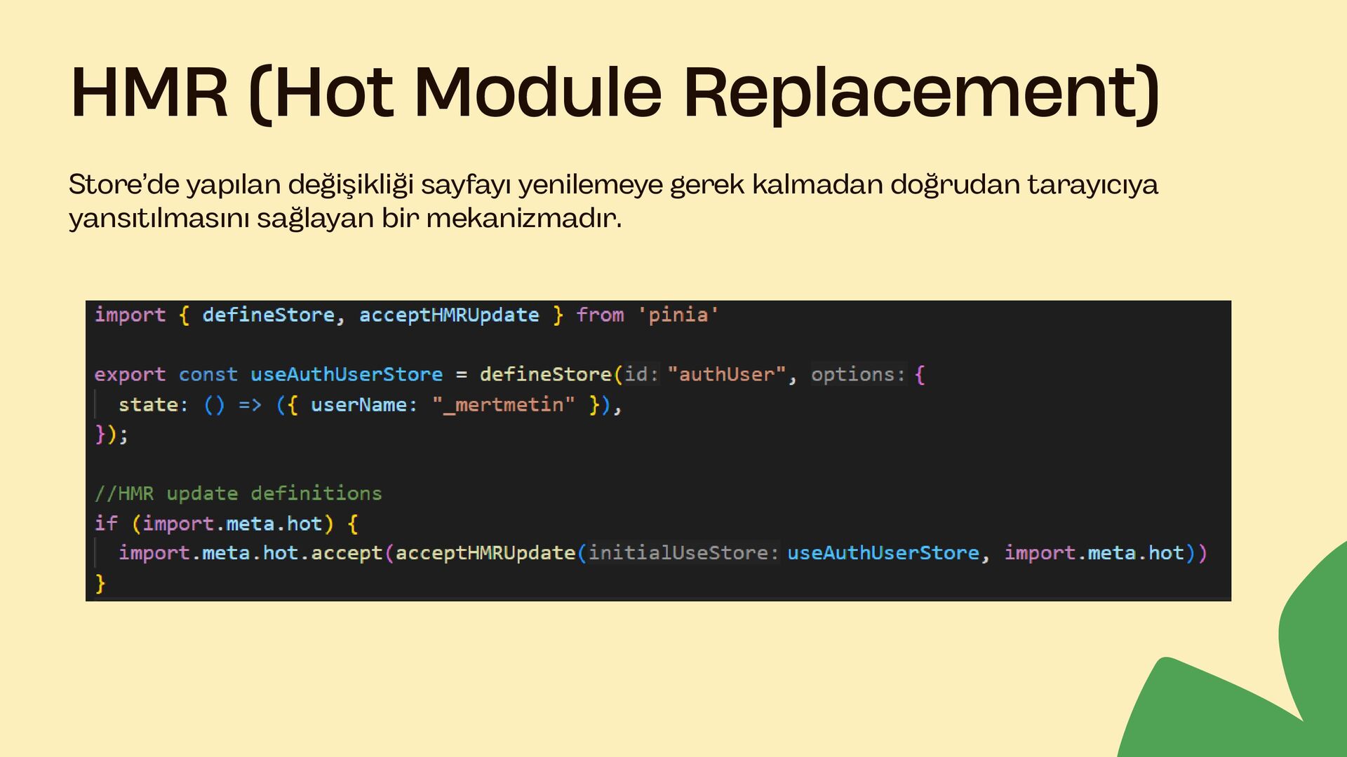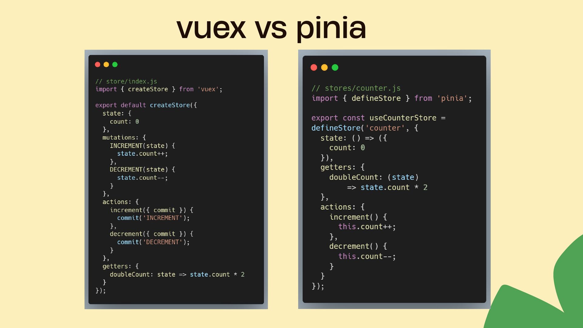 Pinia, daha az boilerplate kod gerektirir. Vuex, daha ayrıntılıdır. Vuex - mutations => Pinia - actions or state, Pinia, hot reload değişikliği destekler.