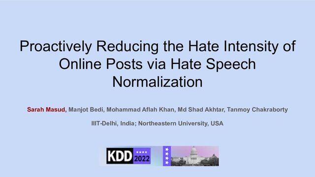 Proactively Reducing the Hate Intensity of Online Posts via Hate Speech Normalization, accepted in ADS track, full paper at KDD 2022.