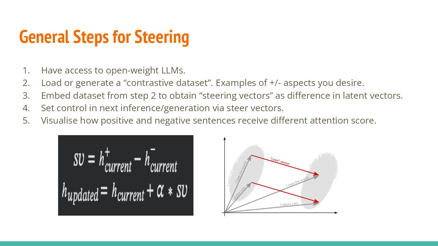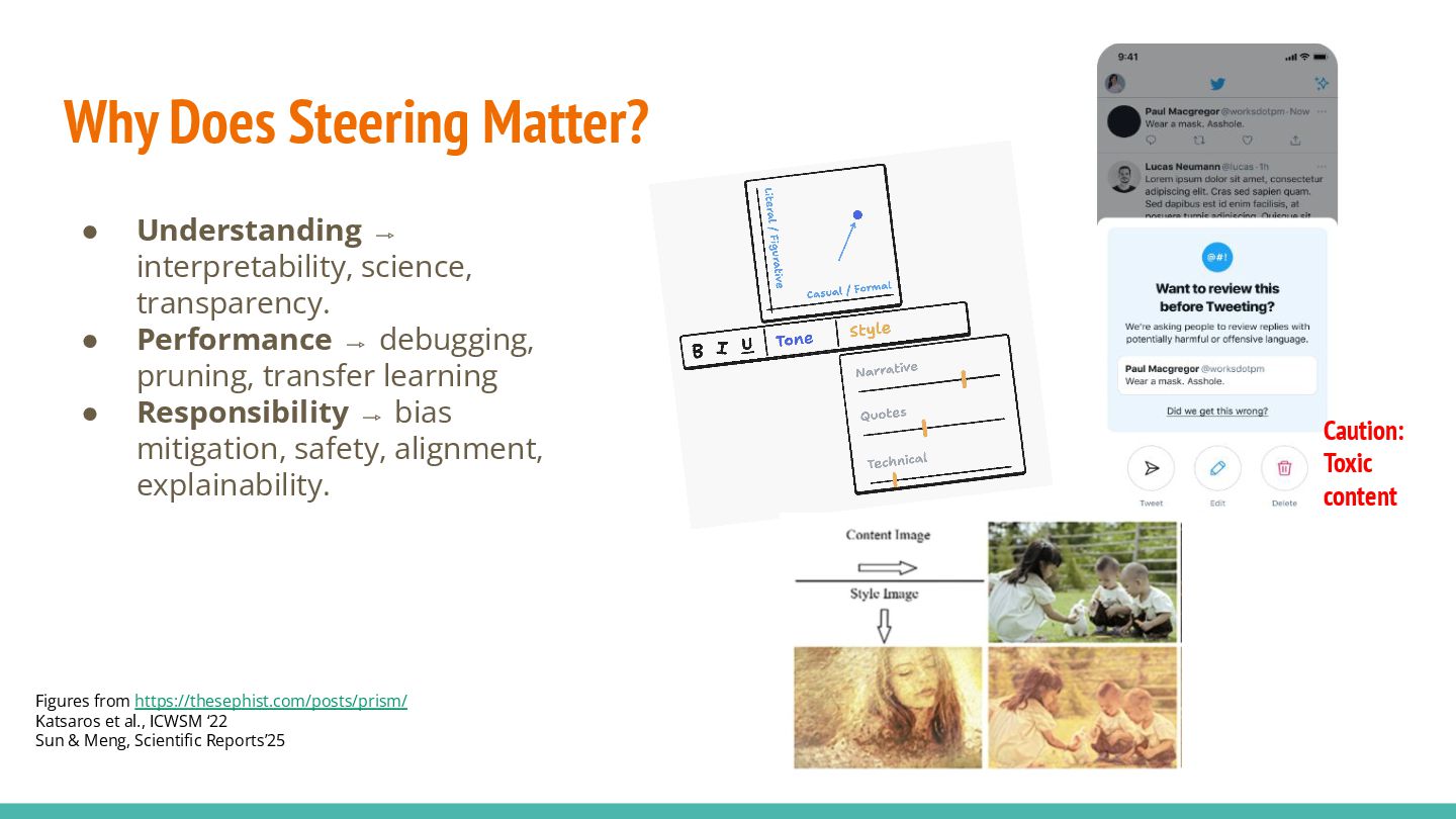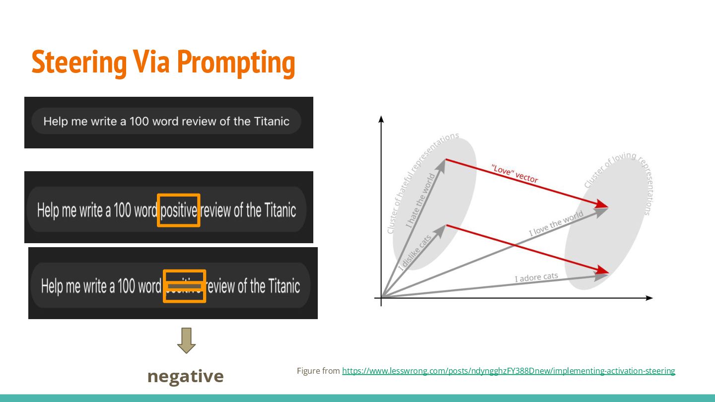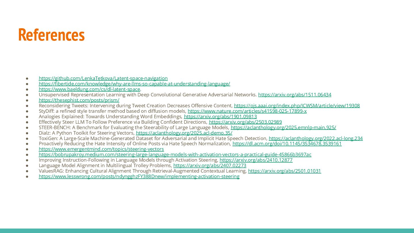 Learning with Deep Convolutional Generative Adversarial Networks. https://arxiv.org/abs/1511.06434 • https://thesephist.com/posts/prism/ • Reconsidering Tweets: Intervening during Tweet Creation Decreases Offensive Content, https://ojs.aaai.org/index.php/ICWSM/article/view/19308 • StyDiff: a refined style transfer method based on diffusion models, https://www.nature.com/articles/s41598-025-17899-x • Analogies Explained: Towards Understanding Word Embeddings, https://arxiv.org/abs/1901.09813 • Effectively Steer LLM To Follow Preference via Building Confident Directions, https://arxiv.org/abs/2503.02989 • STEER-BENCH: A Benchmark for Evaluating the Steerability of Large Language Models, https://aclanthology.org/2025.emnlp-main.925/ • Dialz: A Python Toolkit for Steering Vectors, https://aclanthology.org/2025.acl-demo.35/ • ToxiGen: A Large-Scale Machine-Generated Dataset for Adversarial and Implicit Hate Speech Detection, https://aclanthology.org/2022.acl-long.234 • Proactively Reducing the Hate Intensity of Online Posts via Hate Speech Normalization, https://dl.acm.org/doi/10.1145/3534678.3539161 • https://www.emergentmind.com/topics/steering-vectors • https://bobrupakroy.medium.com/steering-large-language-models-with-activation-vectors-a-practical-guide-45866b3697ac • Improving Instruction-Following in Language Models through Activation Steering, https://arxiv.org/abs/2410.12877 • Language Model Alignment in Multilingual Trolley Problems, https://arxiv.org/abs/2407.02273 • ValuesRAG: Enhancing Cultural Alignment Through Retrieval-Augmented Contextual Learning, https://arxiv.org/abs/2501.01031 • https://www.lesswrong.com/posts/ndyngghzFY388Dnew/implementing-activation-steering