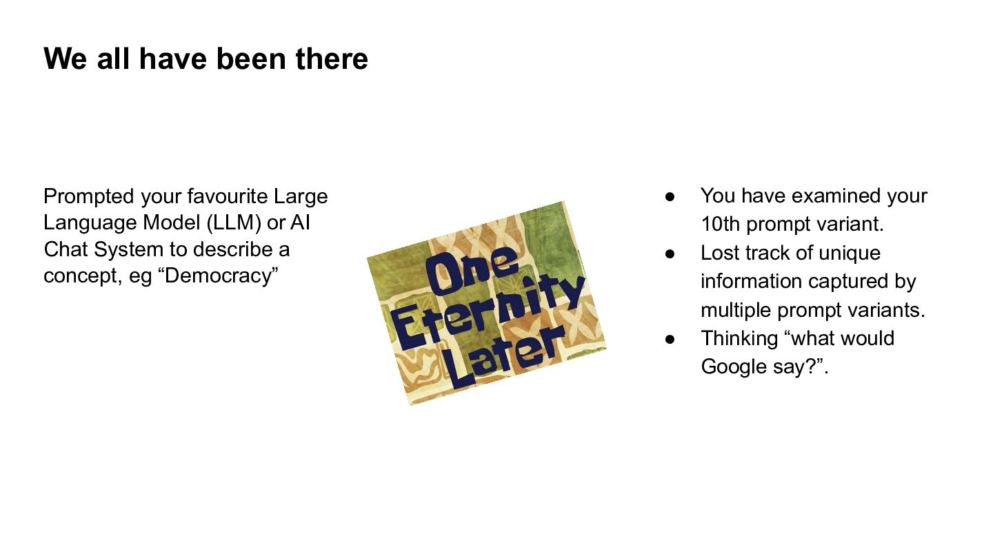 Model (LLM) or AI Chat System to describe a concept, eg “Democracy” • You have examined your 10th prompt variant. • Lost track of unique information captured by multiple prompt variants. • Thinking “what would Google say?”.