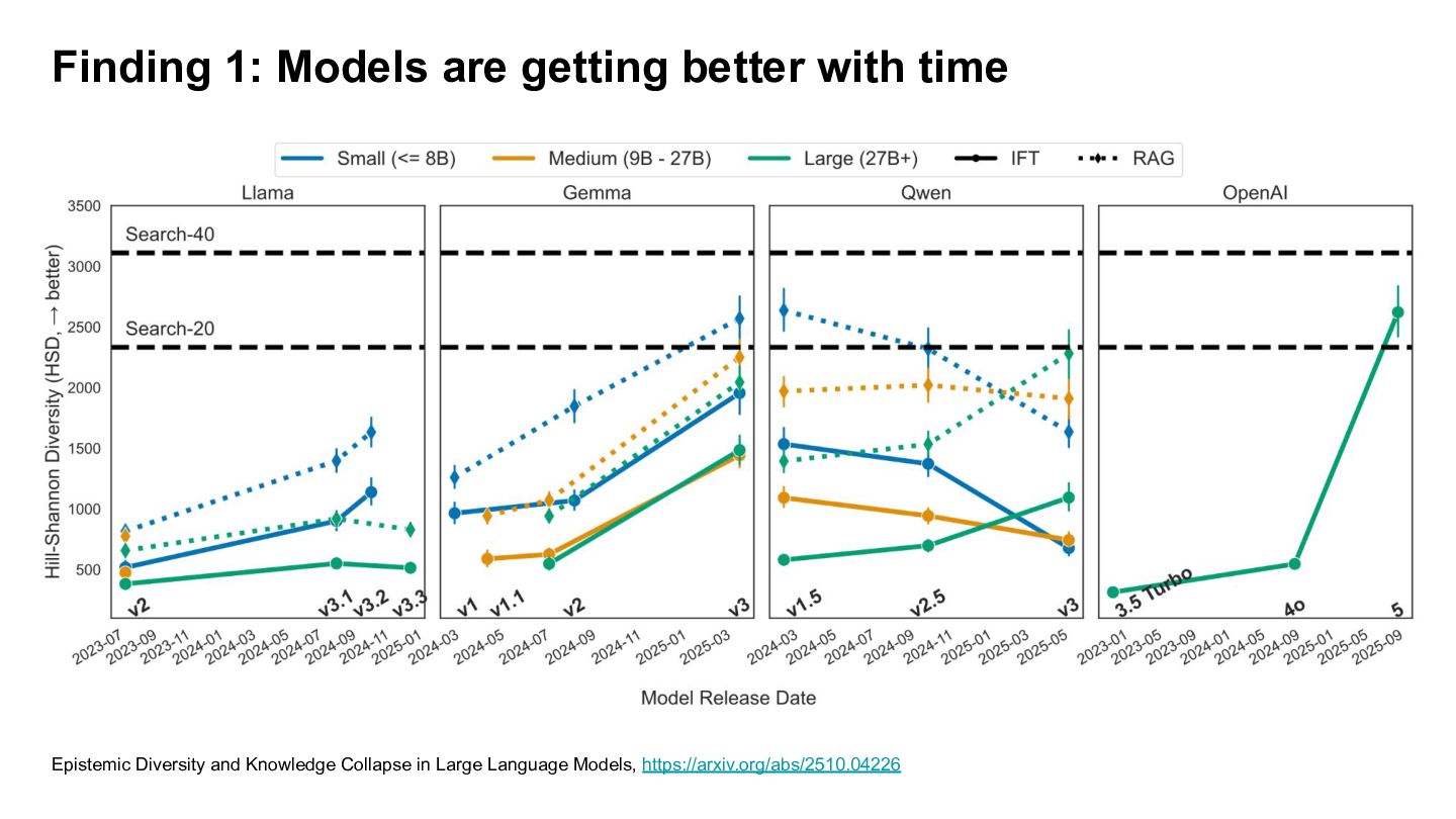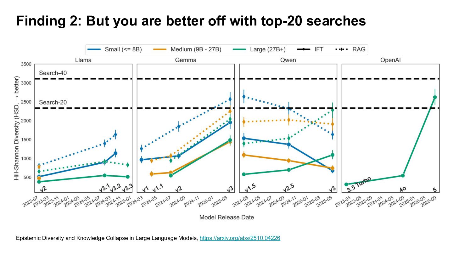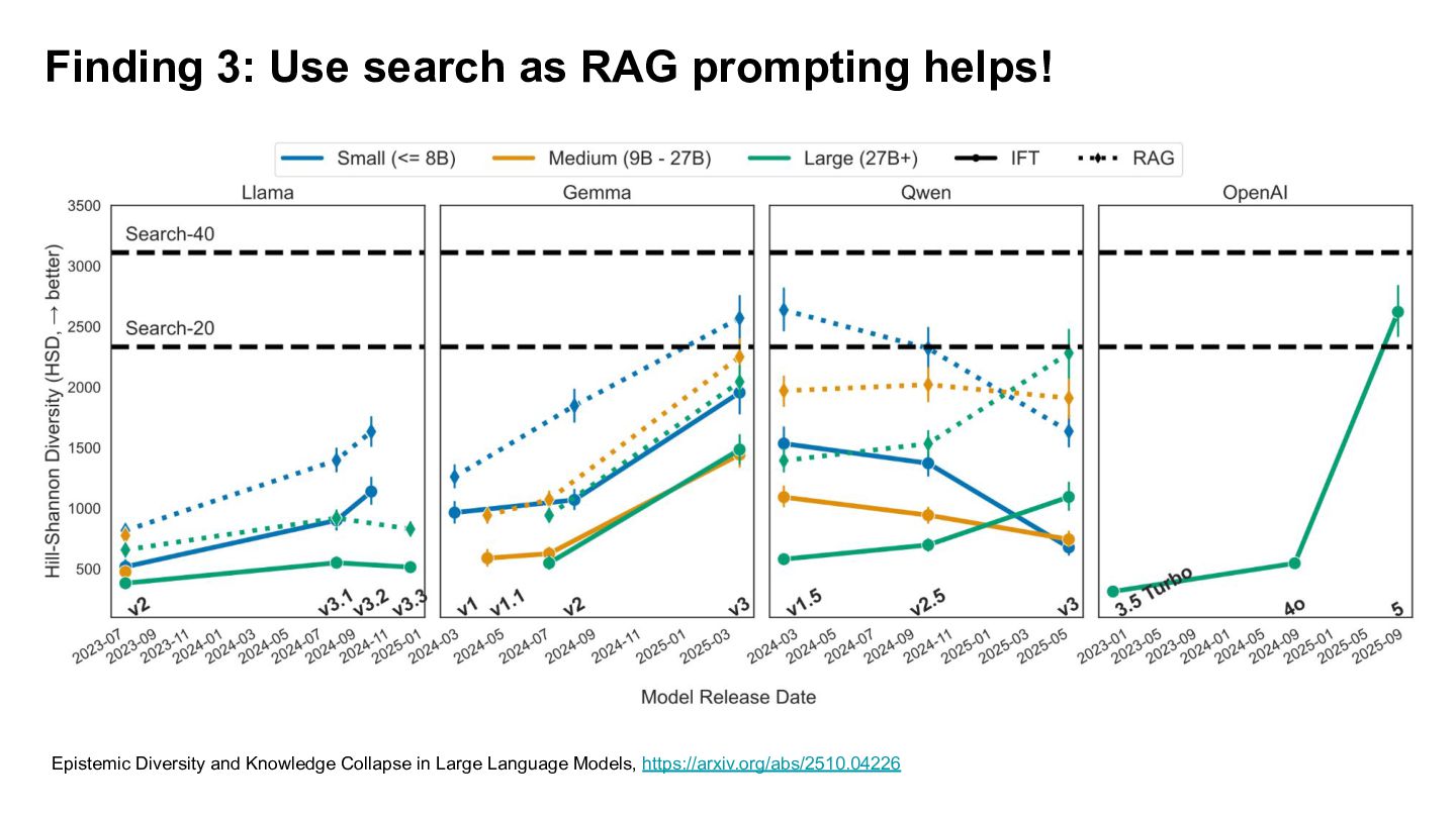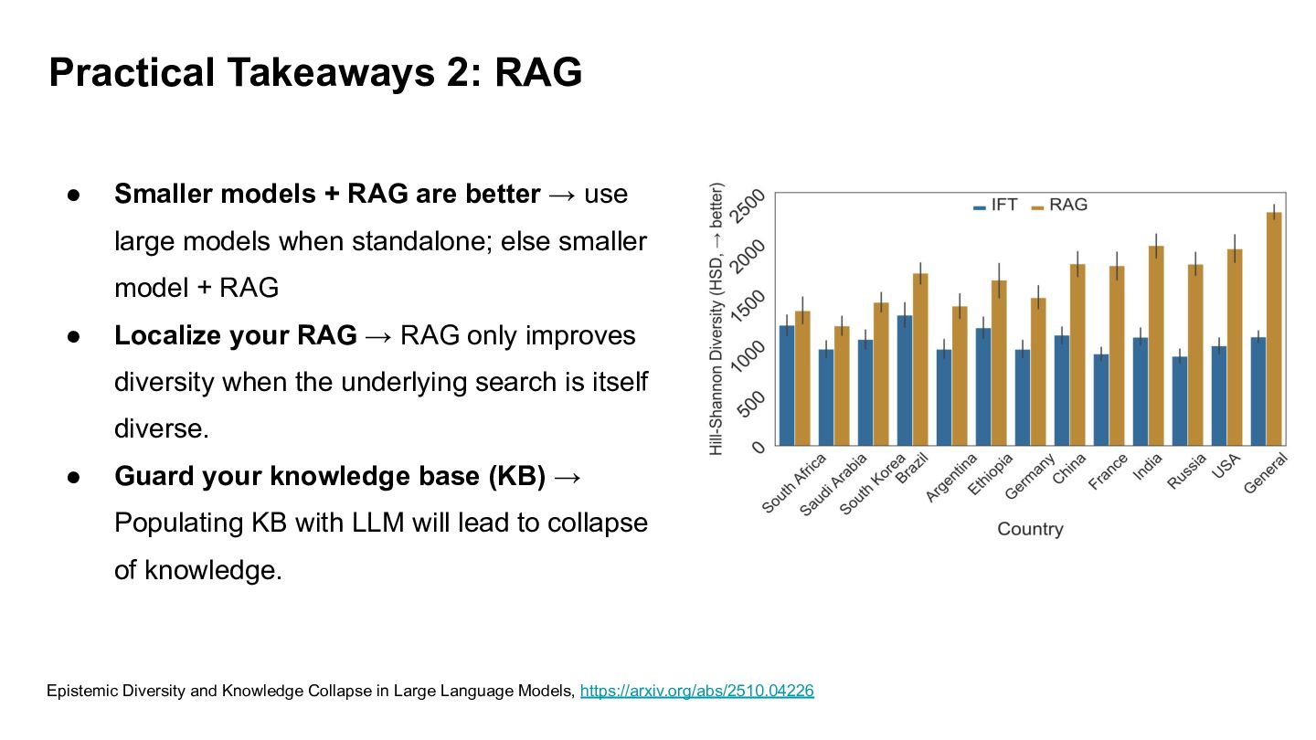 better → use large models when standalone; else smaller model + RAG • Localize your RAG → RAG only improves diversity when the underlying search is itself diverse. • Guard your knowledge base (KB) → Populating KB with LLM will lead to collapse of knowledge. Epistemic Diversity and Knowledge Collapse in Large Language Models, https://arxiv.org/abs/2510.04226