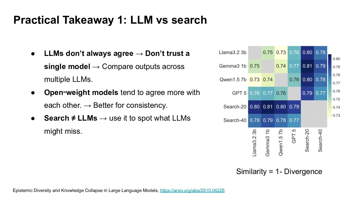 agree → Don’t trust a single model → Compare outputs across multiple LLMs. • Open‑weight models tend to agree more with each other. → Better for consistency. • Search ≠ LLMs → use it to spot what LLMs might miss. Epistemic Diversity and Knowledge Collapse in Large Language Models, https://arxiv.org/abs/2510.04226 Similarity = 1- Divergence