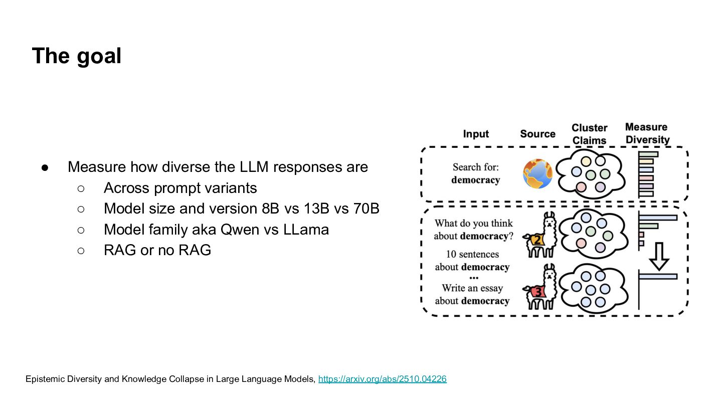 ◦ Across prompt variants ◦ Model size and version 8B vs 13B vs 70B ◦ Model family aka Qwen vs LLama ◦ RAG or no RAG Epistemic Diversity and Knowledge Collapse in Large Language Models, https://arxiv.org/abs/2510.04226