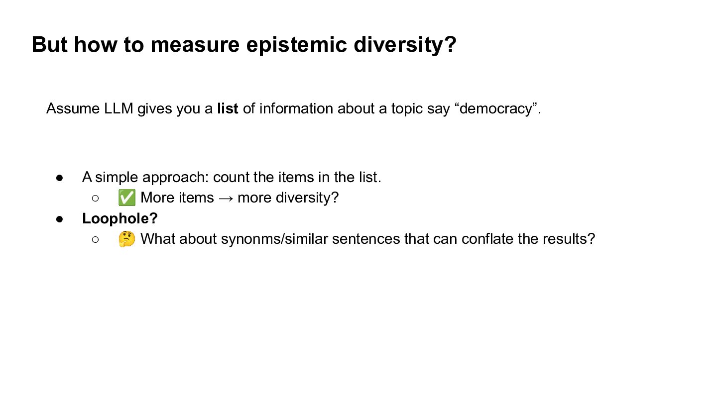 a list of information about a topic say “democracy”. • A simple approach: count the items in the list. ◦ ✅ More items → more diversity? • Loophole? ◦ 🤔 What about synonms/similar sentences that can conflate the results?