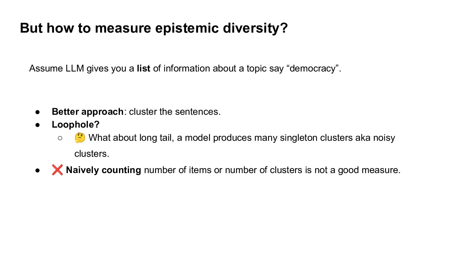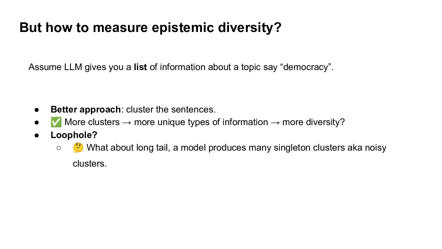 a list of information about a topic say “democracy”. • Better approach: cluster the sentences. • ✅ More clusters → more unique types of information → more diversity? • Loophole? ◦ 🤔 What about long tail, a model produces many singleton clusters aka noisy clusters.