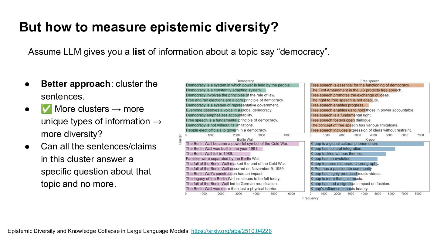 a list of information about a topic say “democracy”. • Better approach: cluster the sentences. • ✅ More clusters → more unique types of information → more diversity? • Can all the sentences/claims in this cluster answer a specific question about that topic and no more. Epistemic Diversity and Knowledge Collapse in Large Language Models, https://arxiv.org/abs/2510.04226