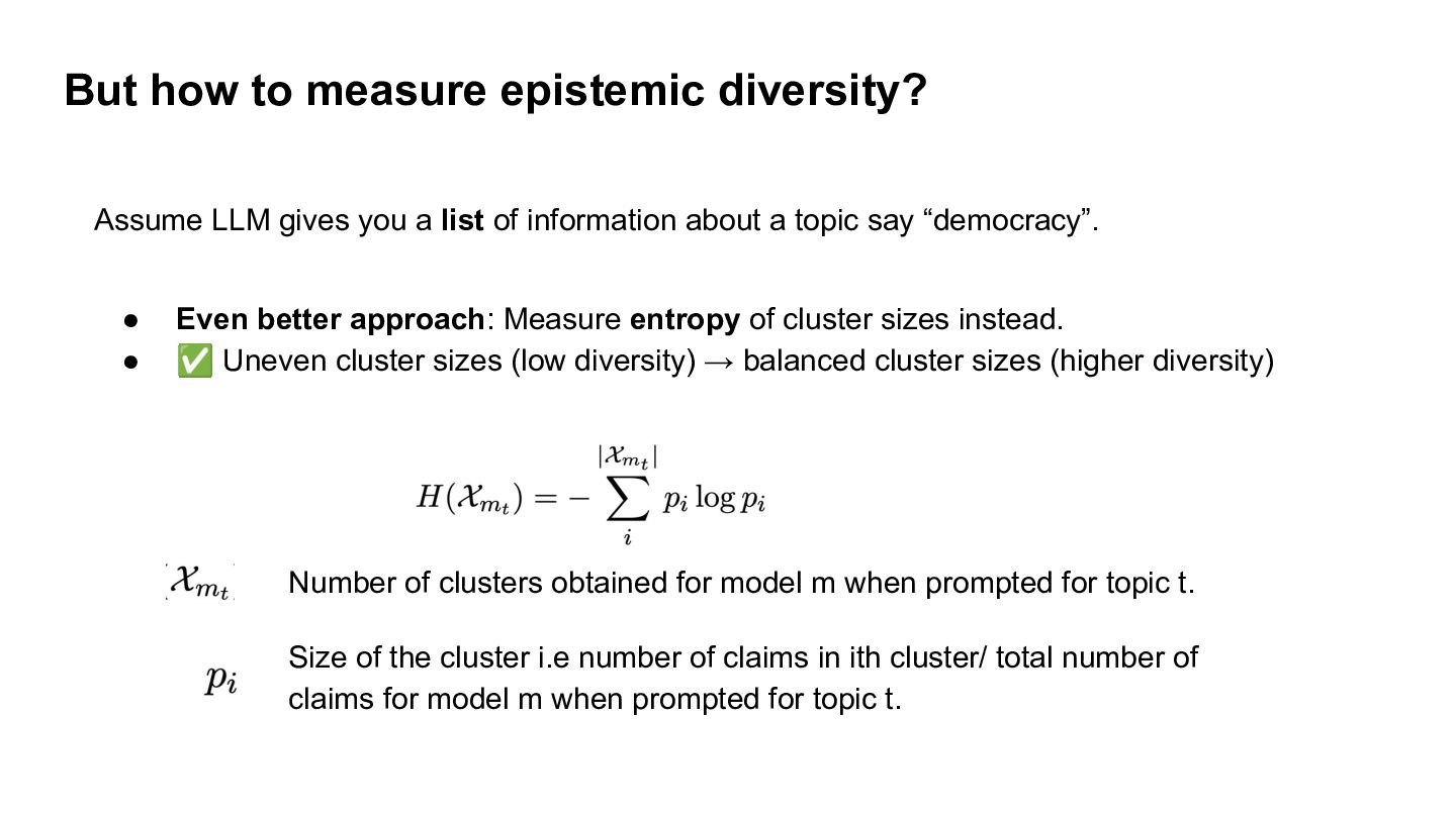 a list of information about a topic say “democracy”. • Even better approach: Measure entropy of cluster sizes instead. • ✅ Uneven cluster sizes (low diversity) → balanced cluster sizes (higher diversity) Number of clusters obtained for model m when prompted for topic t. Size of the cluster i.e number of claims in ith cluster/ total number of claims for model m when prompted for topic t.