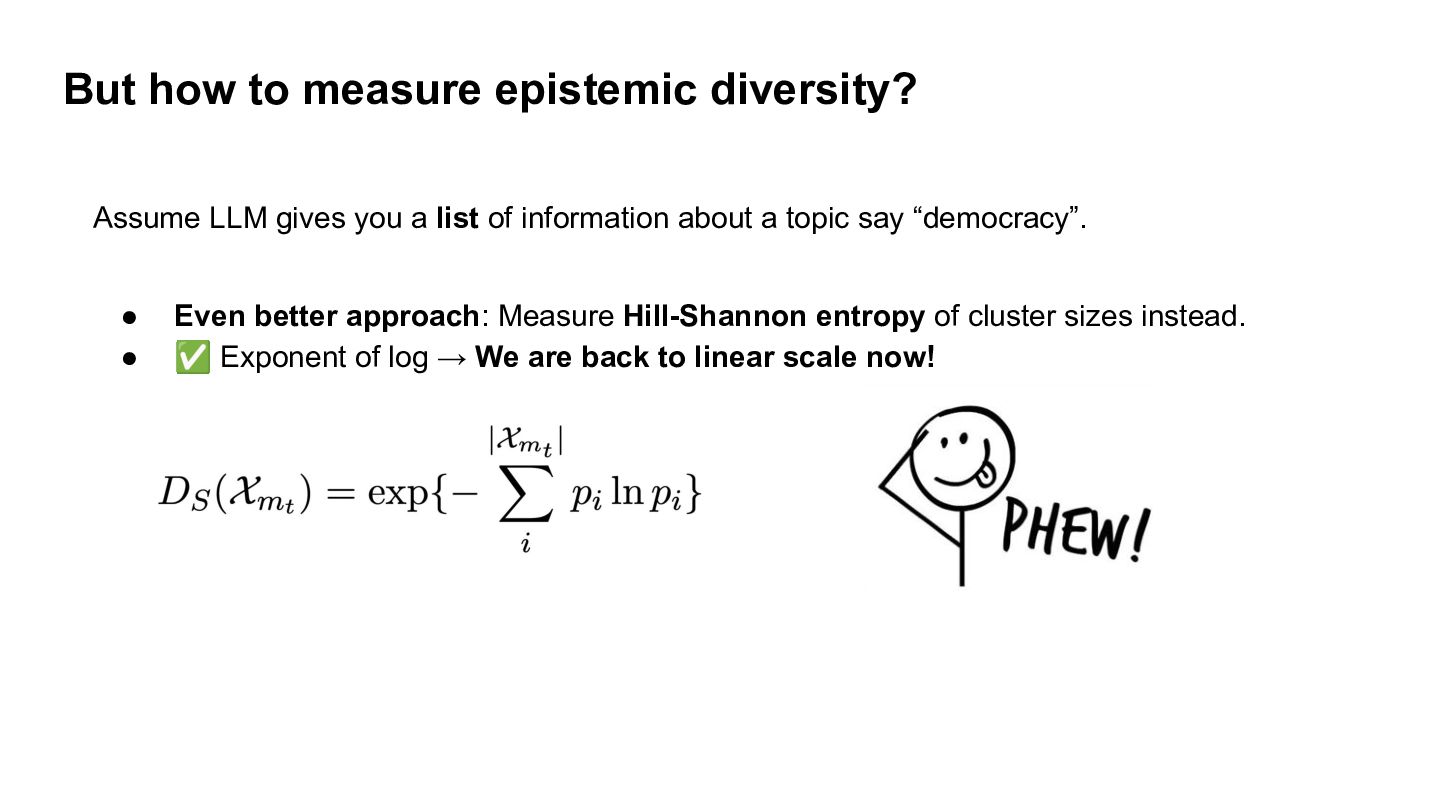 a list of information about a topic say “democracy”. • Even better approach: Measure Hill-Shannon entropy of cluster sizes instead. • ✅ Exponent of log → We are back to linear scale now!