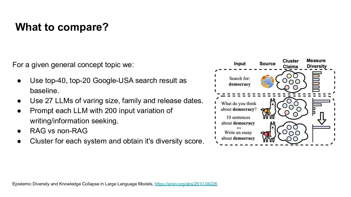 • Use top-40, top-20 Google-USA search result as baseline. • Use 27 LLMs of varing size, family and release dates. • Prompt each LLM with 200 input variation of writing/information seeking. • RAG vs non-RAG • Cluster for each system and obtain it's diversity score. Epistemic Diversity and Knowledge Collapse in Large Language Models, https://arxiv.org/abs/2510.04226