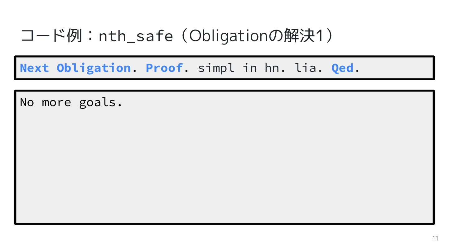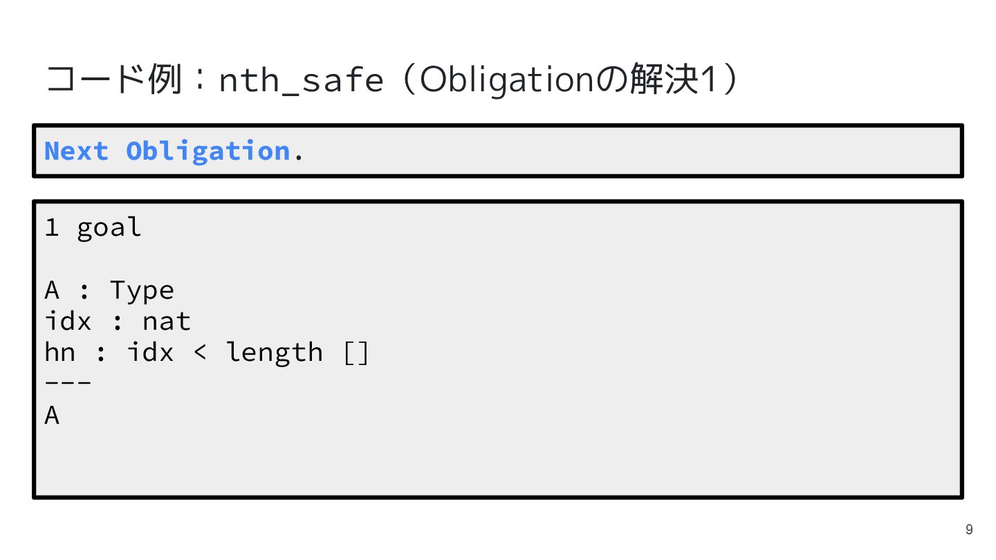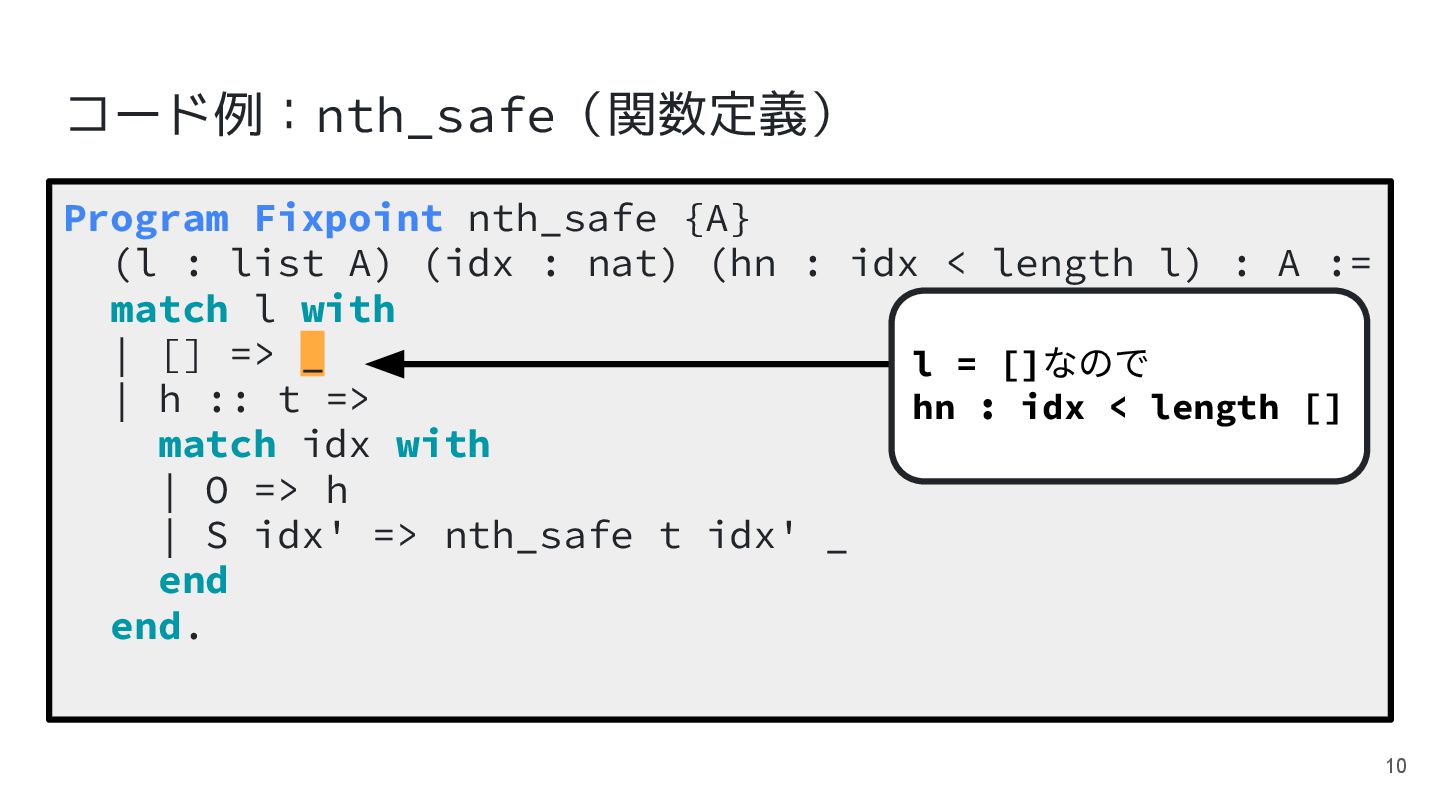 : nat) (hn : idx < length l) : A := match l with | [] => _ | h :: t => match idx with | O => h | S idx' => nth_safe t idx' _ end end. 10 l = []なので hn : idx < length []