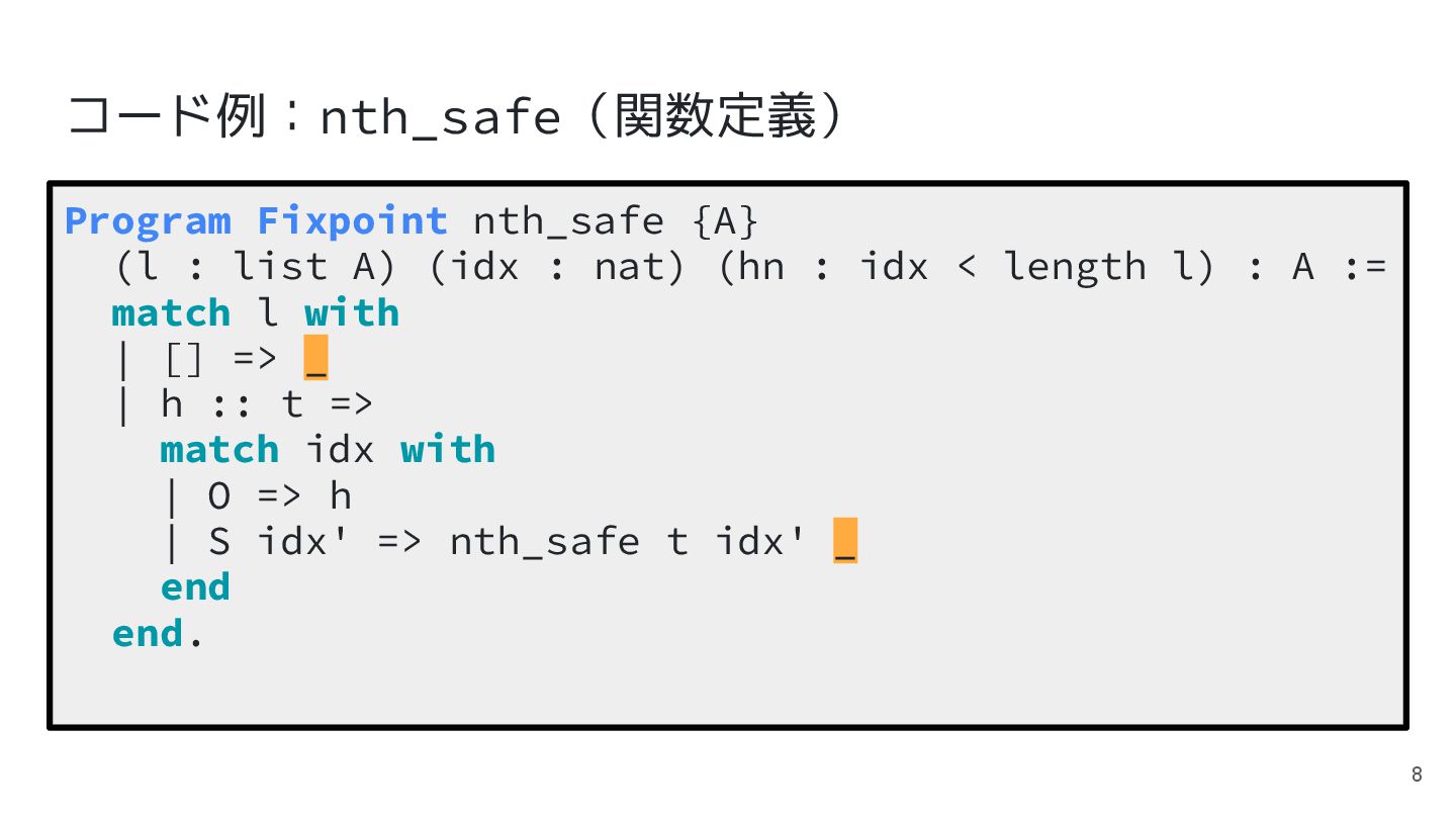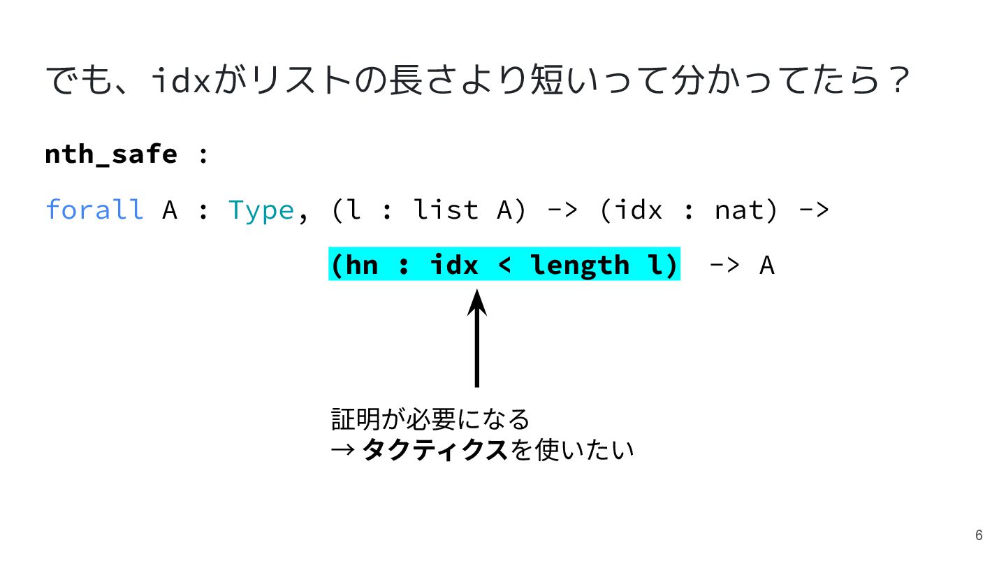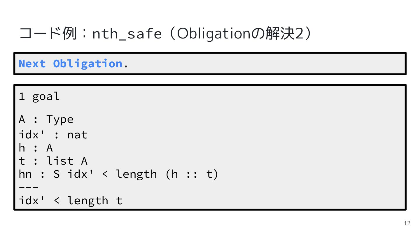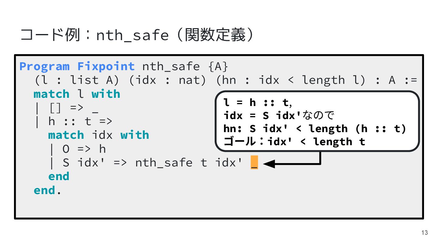 : nat) (hn : idx < length l) : A := match l with | [] => _ | h :: t => match idx with | O => h | S idx' => nth_safe t idx' _ end end. 13 l = h :: t, idx = S idx'なので hn: S idx' < length (h :: t) ゴール:idx' < length t