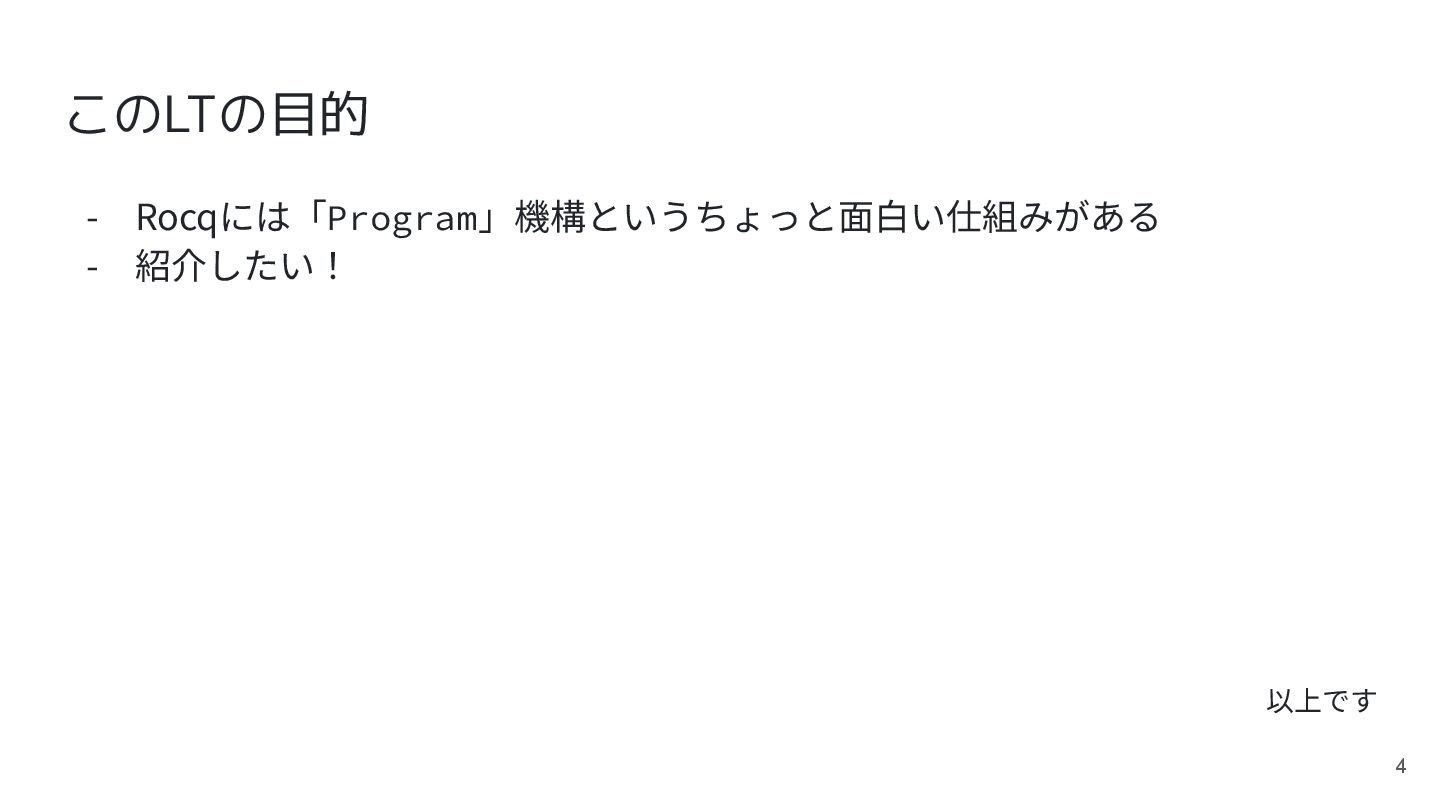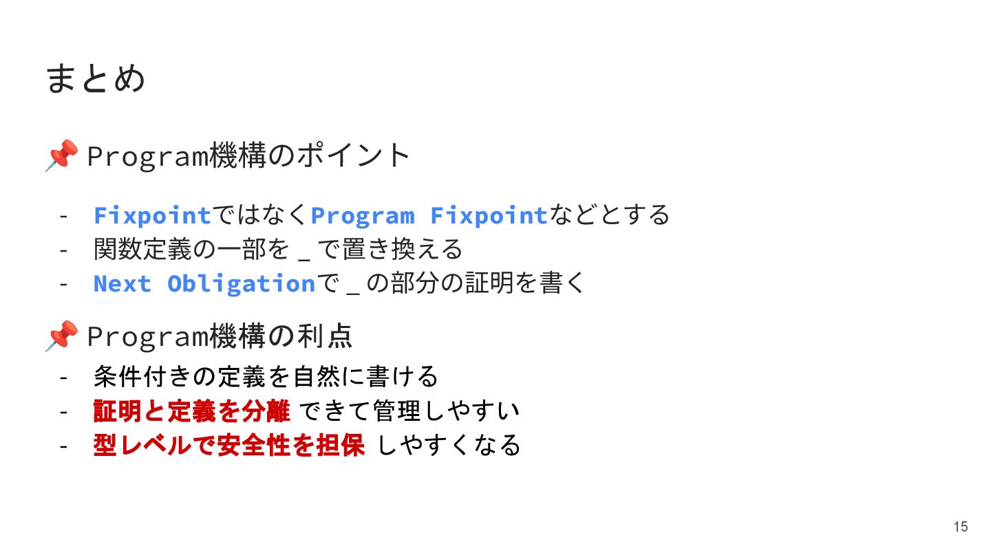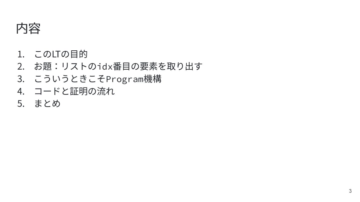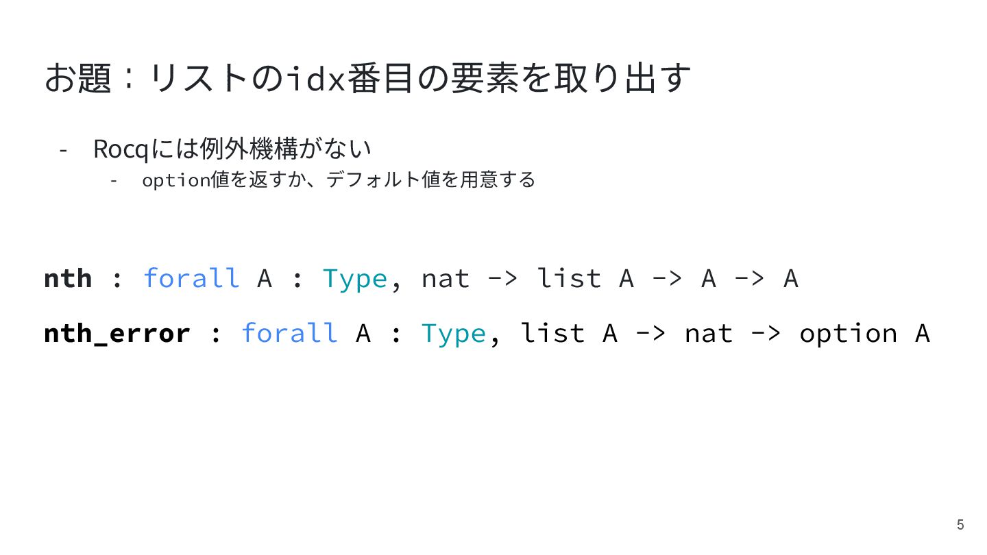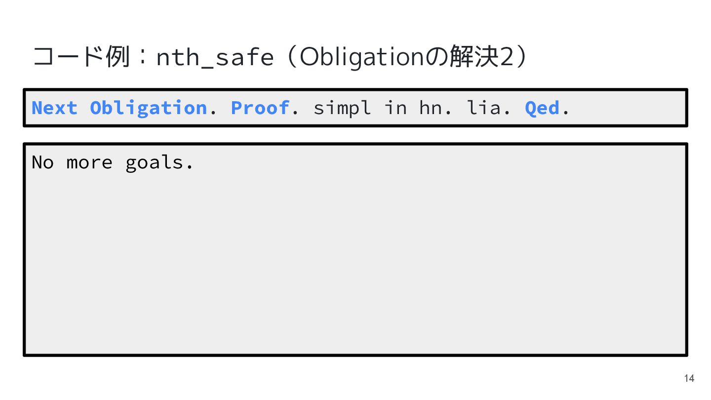 : nat) (hn : idx < length l) : A := match l with | [] => _ | h :: t => match idx with | O => h | S idx' => nth_safe t idx' _ end end. 13 l = h :: t, idx = S idx'なので hn: S idx' < length (h :: t) ゴール:idx' < length t