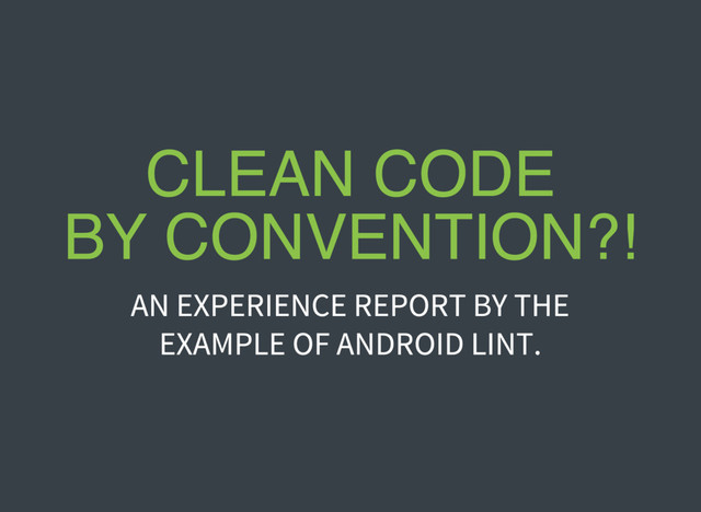 This talk is an experience report which showcases by the example of Android Lint how conventions along with Static Code Analysis may support the application of the Clean Code concept. It's not dogmatic. It's objective is to encourage teams to elicit dedicated conventions as a result of a common agreement process. By doing so we have made positive experiences in triggering awareness for Clean Code.