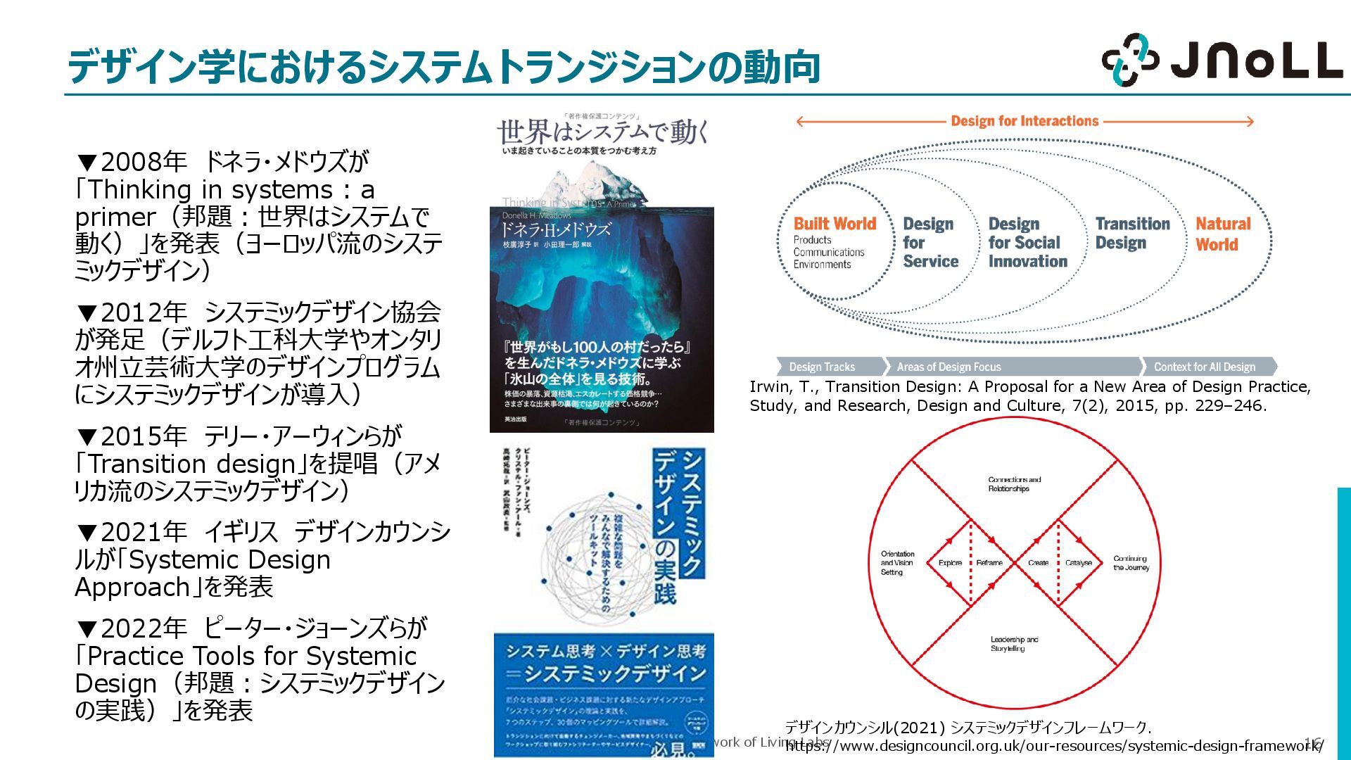 ドネラ・メドウズが 「Thinking in systems : a primer(邦題:世界はシステムで 動く)」を発表(ヨーロッパ流のシステ ミックデザイン) ▼2012年 システミックデザイン協会 が発足(デルフト工科大学やオンタリ オ州立芸術大学のデザインプログラム にシステミックデザインが導入) ▼2015年 テリー・アーウィンらが 「Transition design」を提唱(アメ リカ流のシステミックデザイン) ▼2021年 イギリス デザインカウンシ ルが「Systemic Design Approach」を発表 ▼2022年 ピーター・ジョーンズらが 「Practice Tools for Systemic Design(邦題:システミックデザイン の実践)」を発表 デザインカウンシル(2021) システミックデザインフレームワーク. https://www.designcouncil.org.uk/our-resources/systemic-design-framework/ Irwin, T., Transition Design: A Proposal for a New Area of Design Practice, Study, and Research, Design and Culture, 7(2), 2015, pp. 229–246.